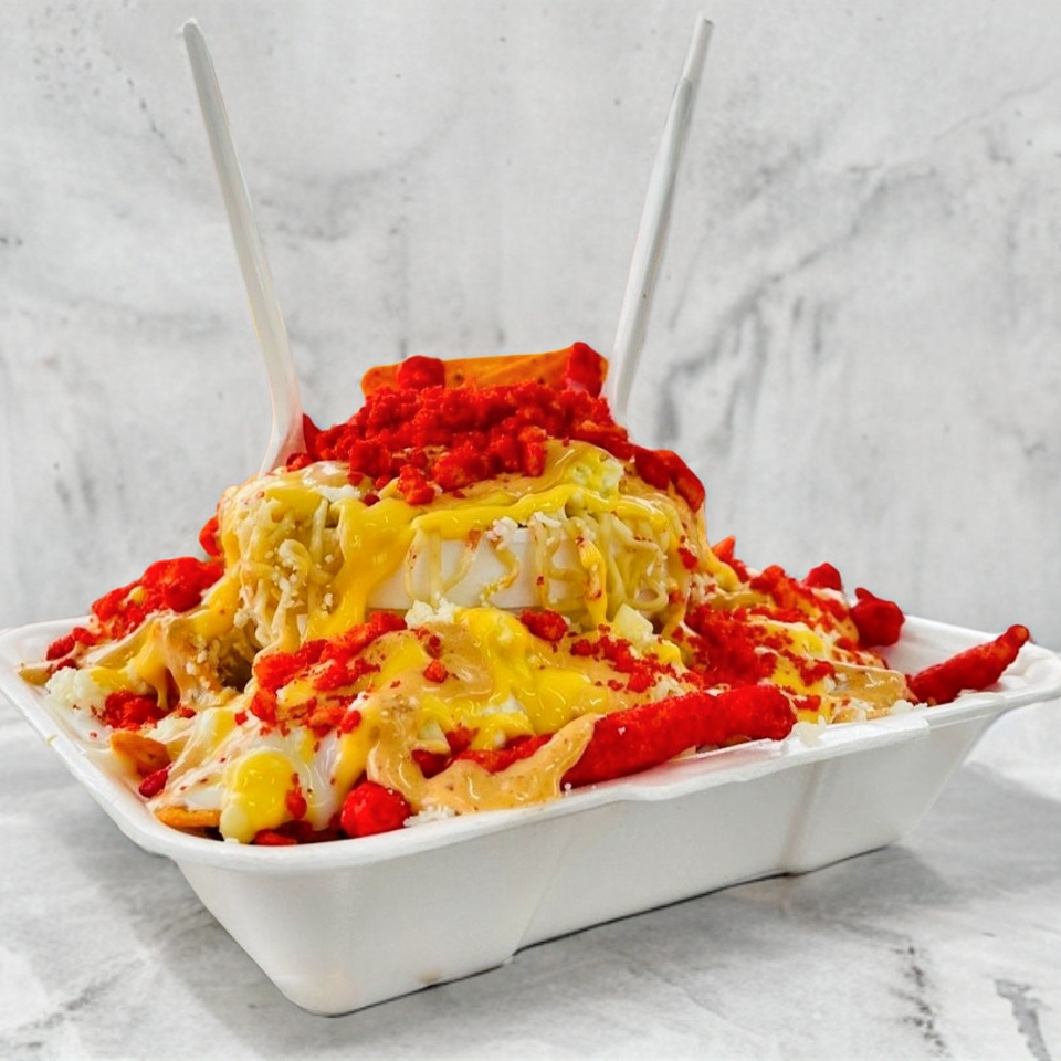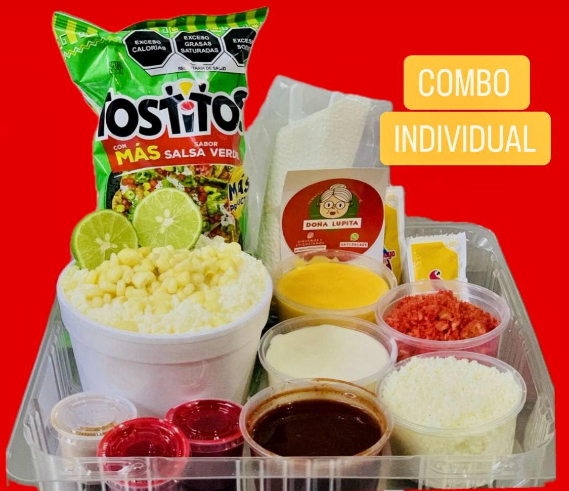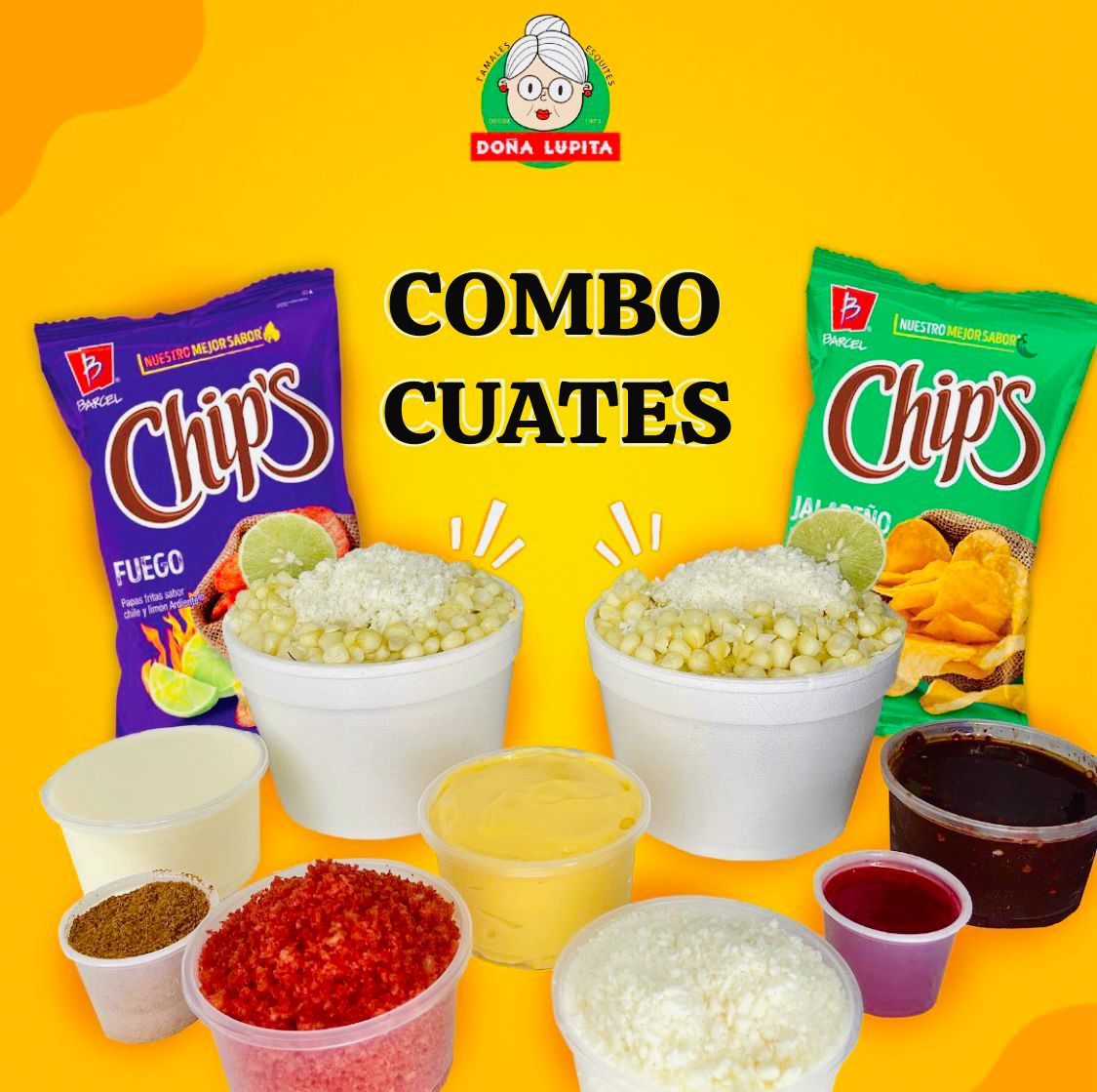 1 Sopa Maruchan, con esquite, crema y queso, con 2 sabritas a elegir. Incluye: aderezo chipotle, queso amarillo, guacamaya, chile, limón y chamoy clásico. Además 1 topping.