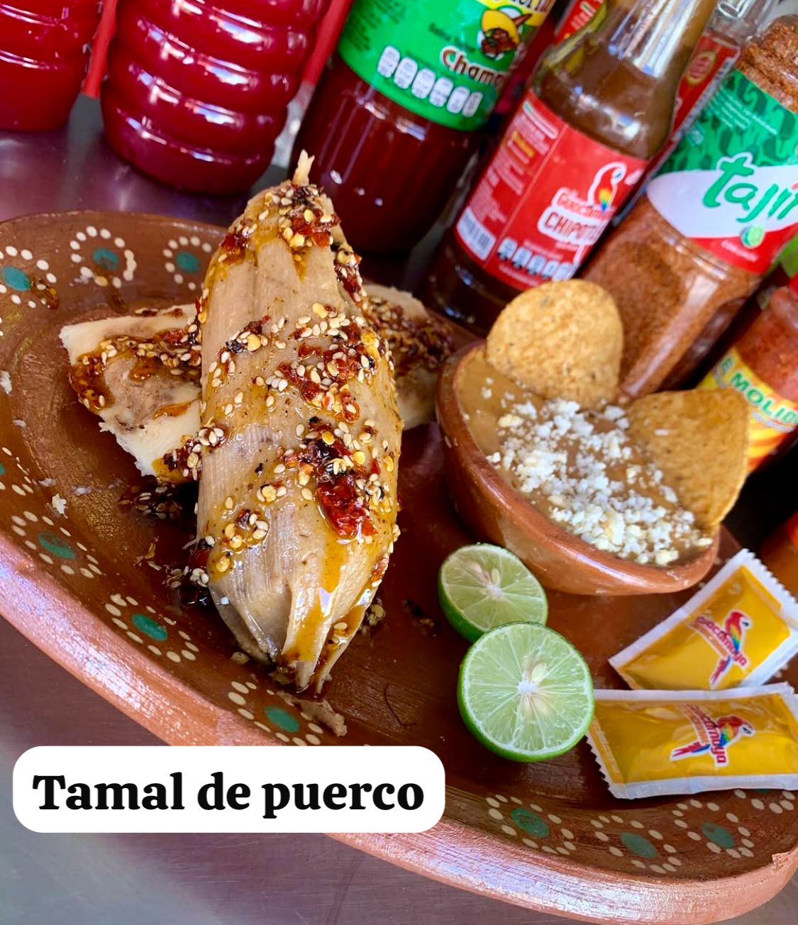 Tamal de tu preferencia, encima esquite con crema y queso. (Incluye salsa guacamaya, chile, limón y chamoy clásico).