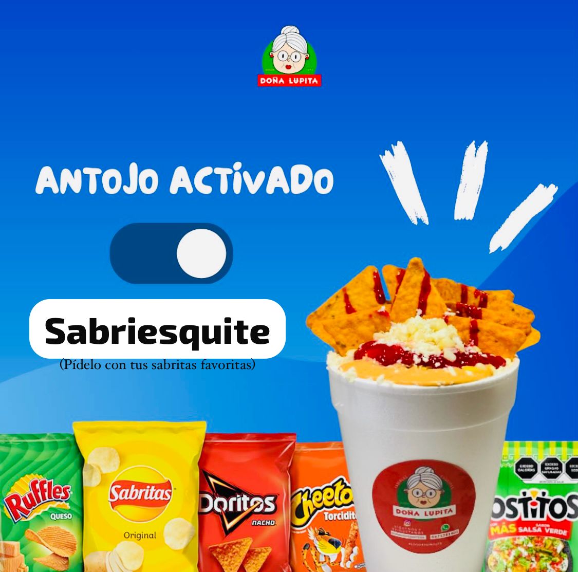 Sabritas favoritas con esquite, crema y queso. (Incluye aparte su salsa , chile, limón y chamoy clásico).
