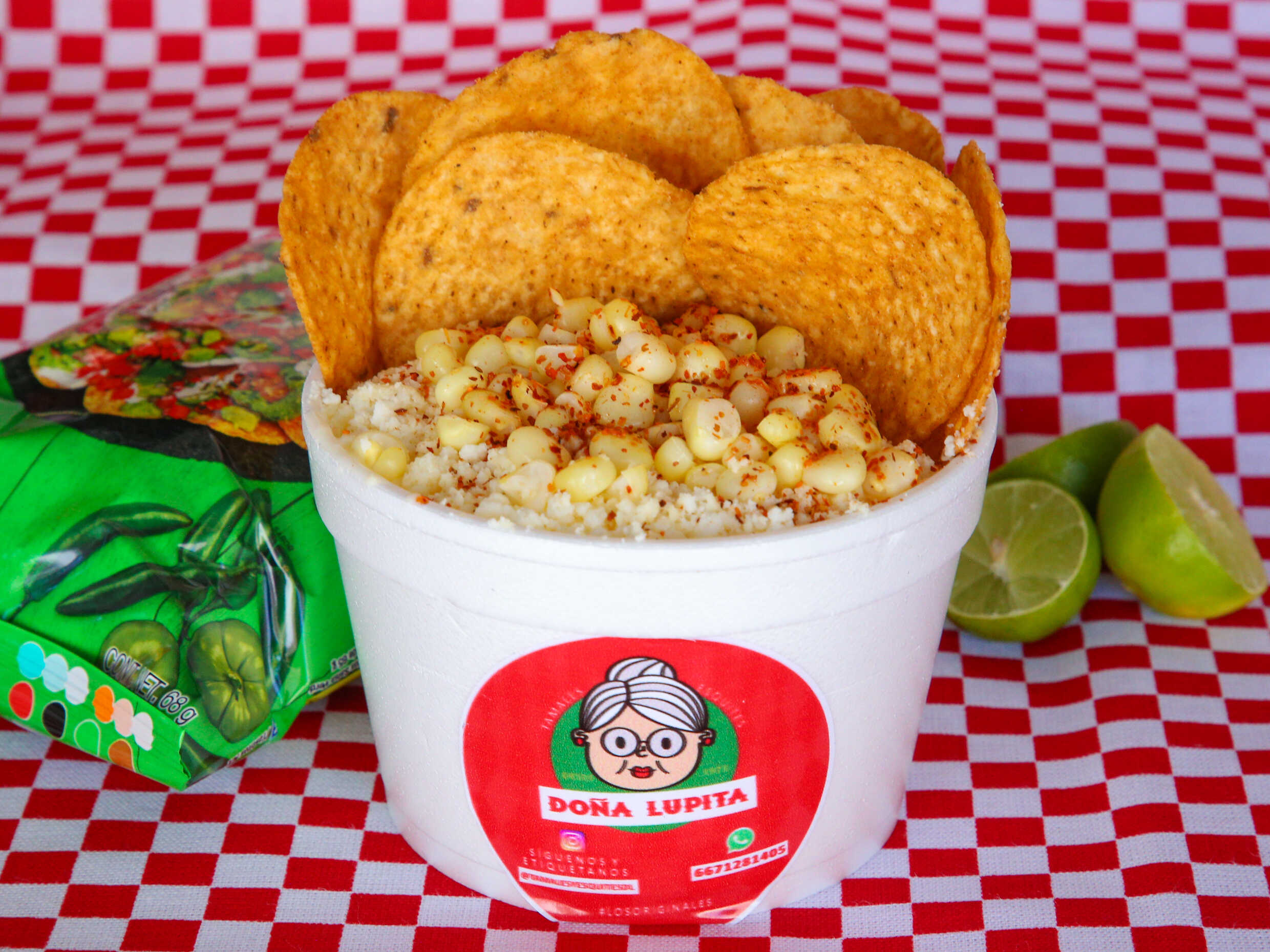 1 Medio litro de esquite, una bolsa de Sabritas, queso amarillo, crema, queso extra, salsa especial y básicas.