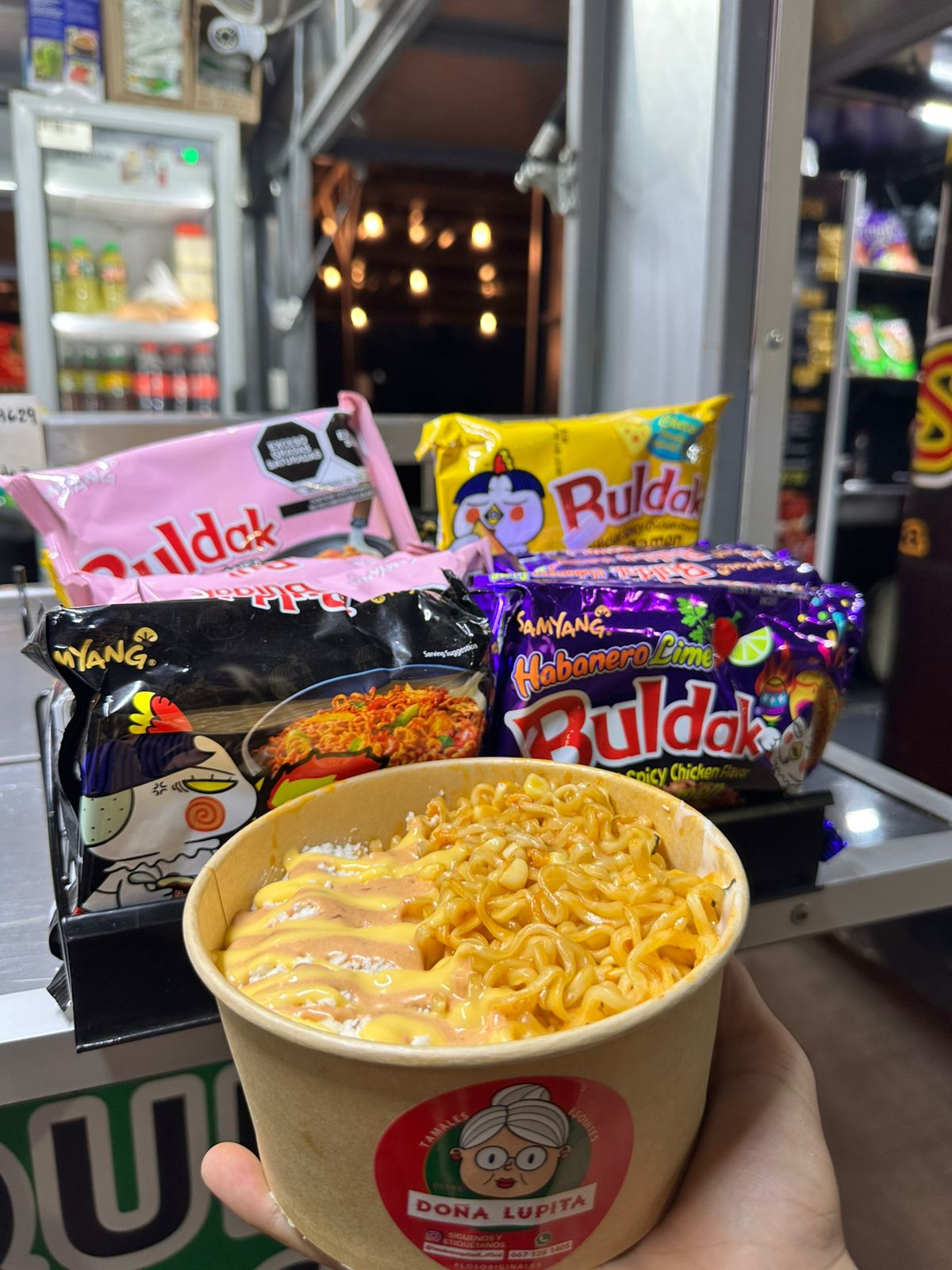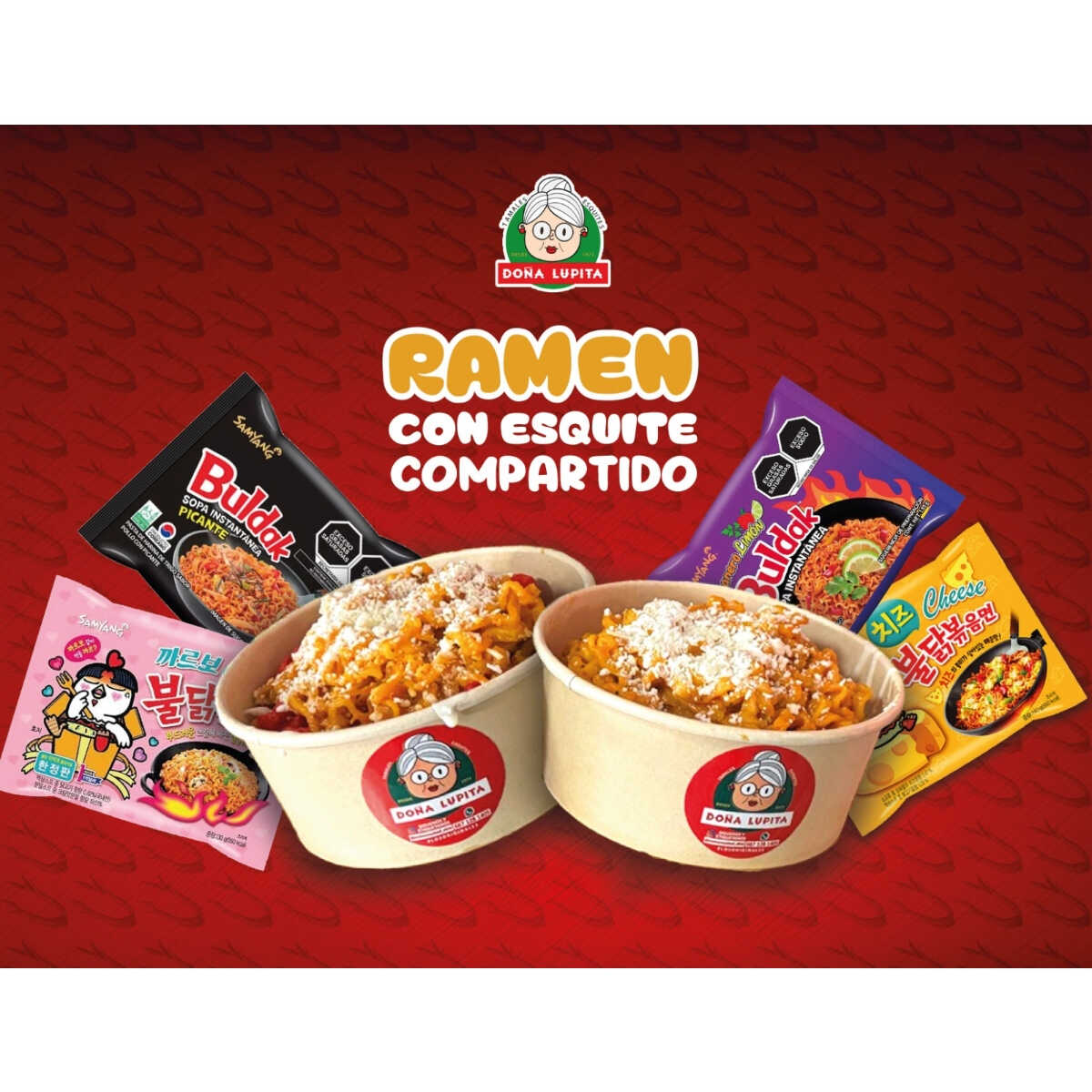 Ramen a elegir, se divide la mitad del ramen en 2 vasos, se prepara con esquite, crema, queso y mayonesa a su elección, como topping se agrega la mitad de unas frituras a su elección a cada vaso.