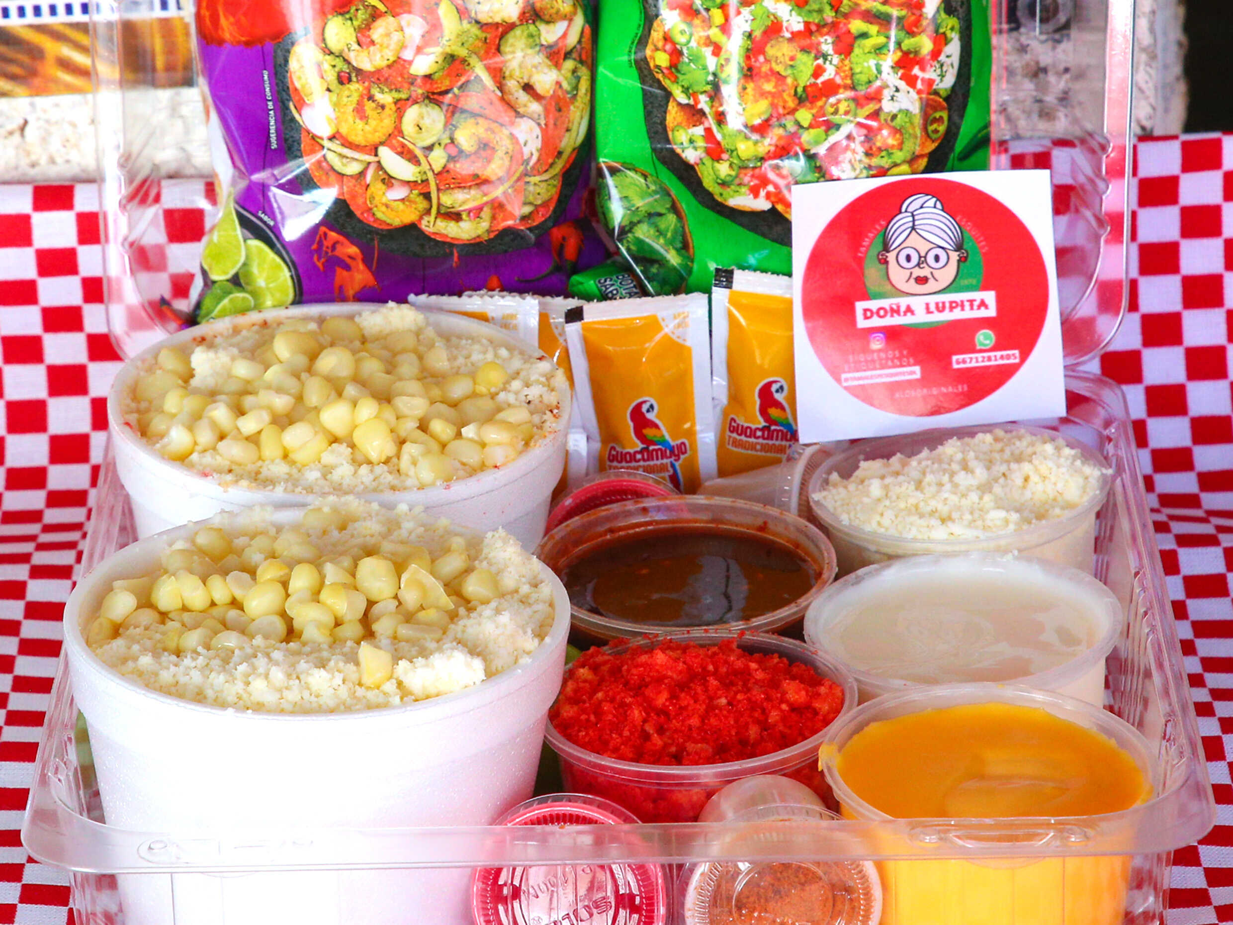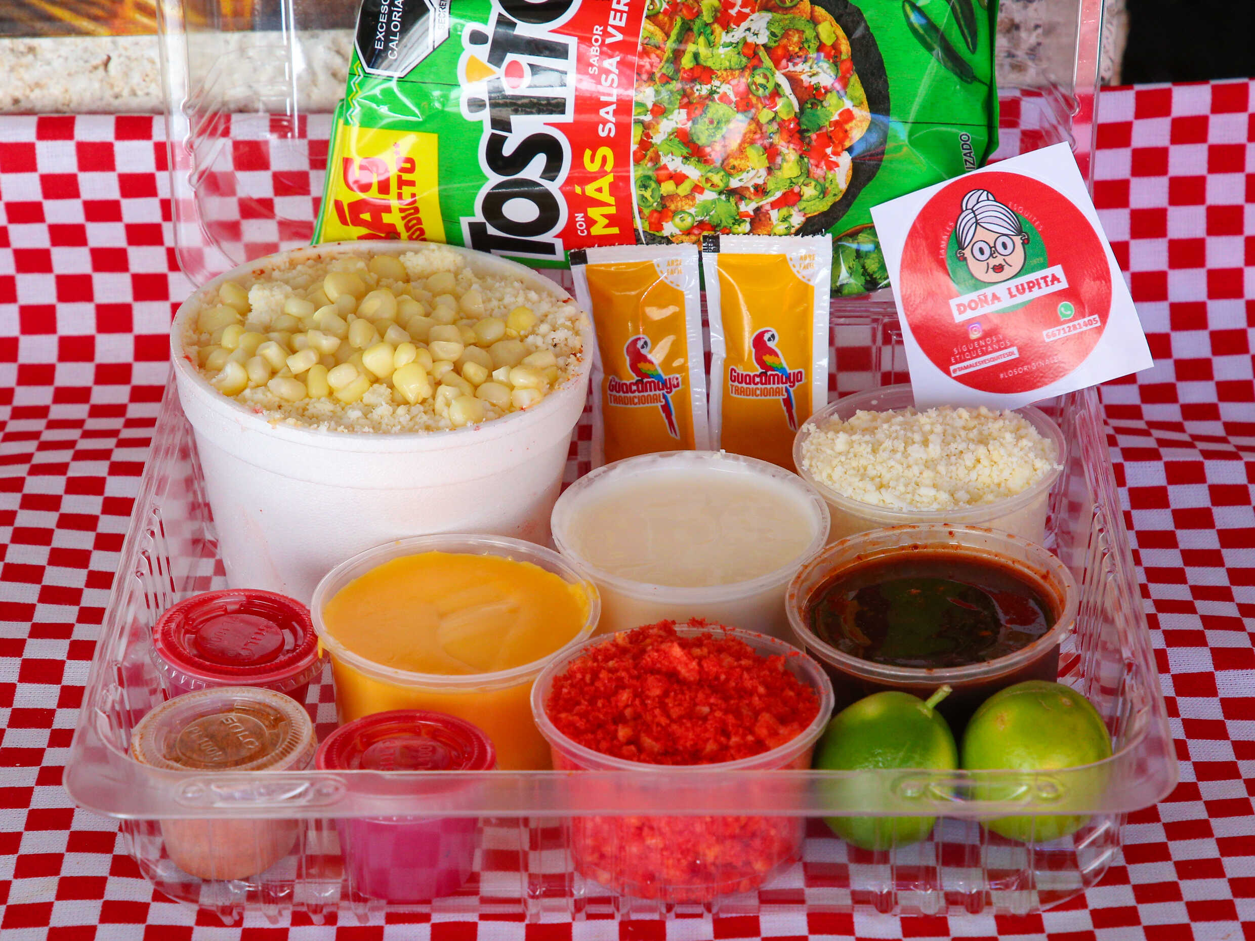 Charola con: 2 medios litros de esquites, 2 Sabritas a escoger: Chips, Cheetos, Doritos, Ruffles, Sabritas. Crema y queso extra, queso para nachos, salsa preparada, salsas básicas y 1 topping a elegir: Cheetos Flamin' Hot, Chips Fuegos, Chips Jalapeño, Takis Fuego, Doritos Nacho.