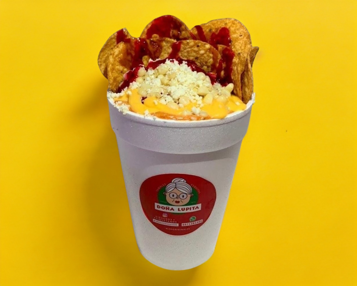 Sabrita aparte para no mojarse, chile en polvo, limón, mas 1/2 litro de grano de elote (servido en un vaso de litro)