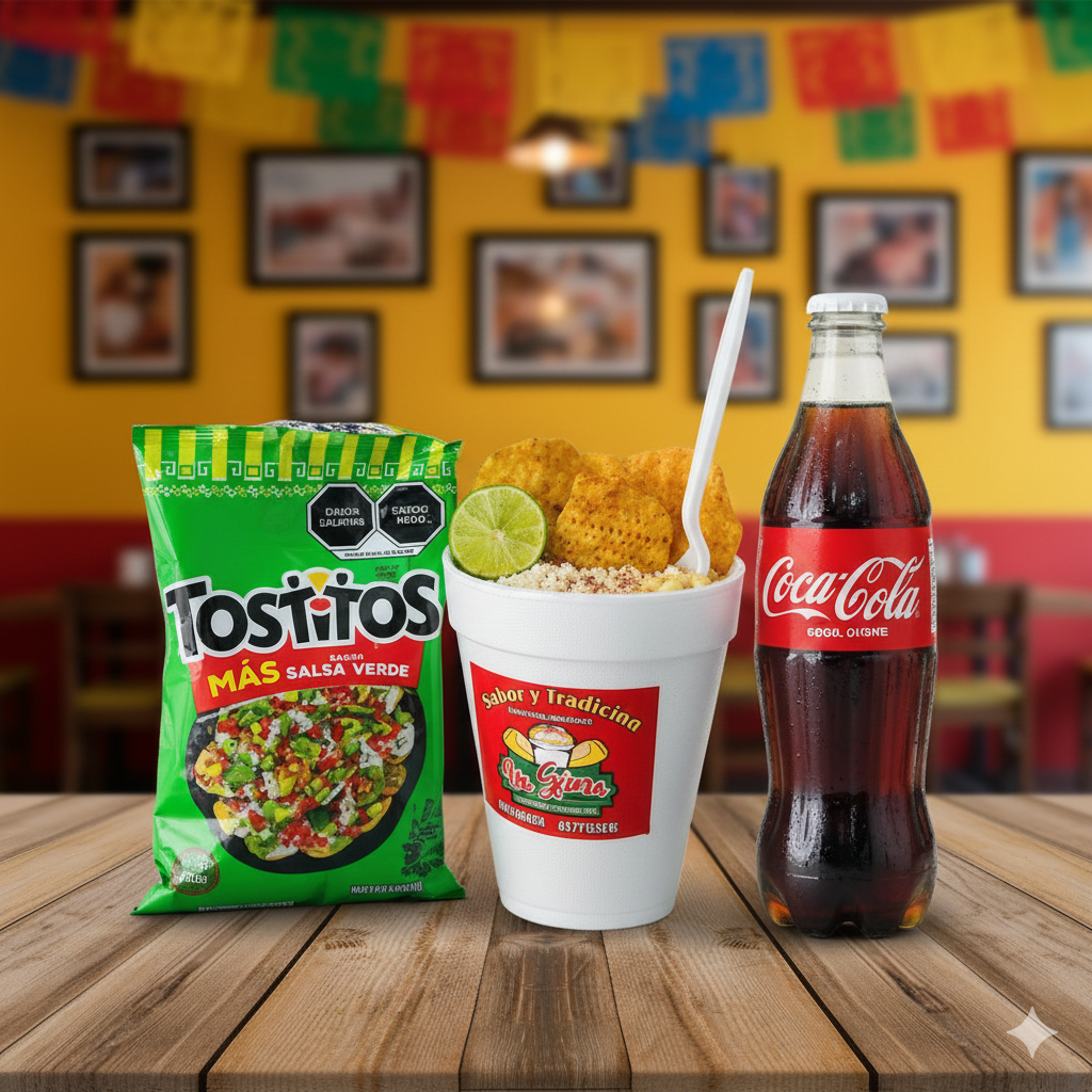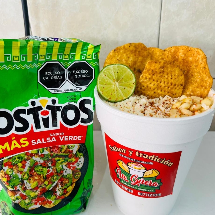 Tostitos salsa verde con delicioso esquite, crema, queso o mayonesa y complementos empacados aparte como limón, salsa Guacamaya regular, salsa Guacamaya mix, chamoy, chile de árbol molido, cubiertos y servilletas.