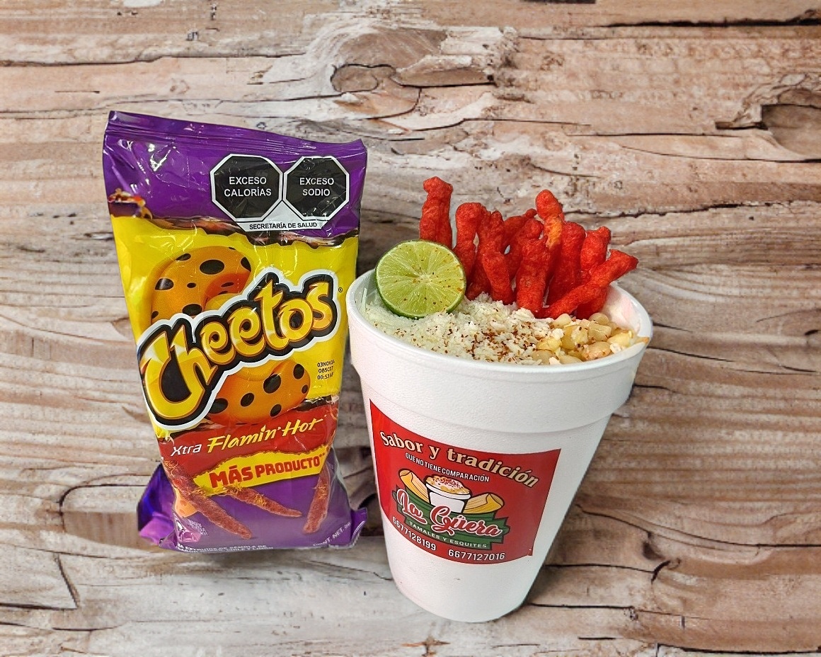 Cheetos flamin' hot con delicioso esquite, crema, queso o mayonesa y complementos empacados aparte como limón, salsa Guacamaya regular, salsa Guacamaya mix, chamoy, chile de árbol molido, cubiertos y servilletas.