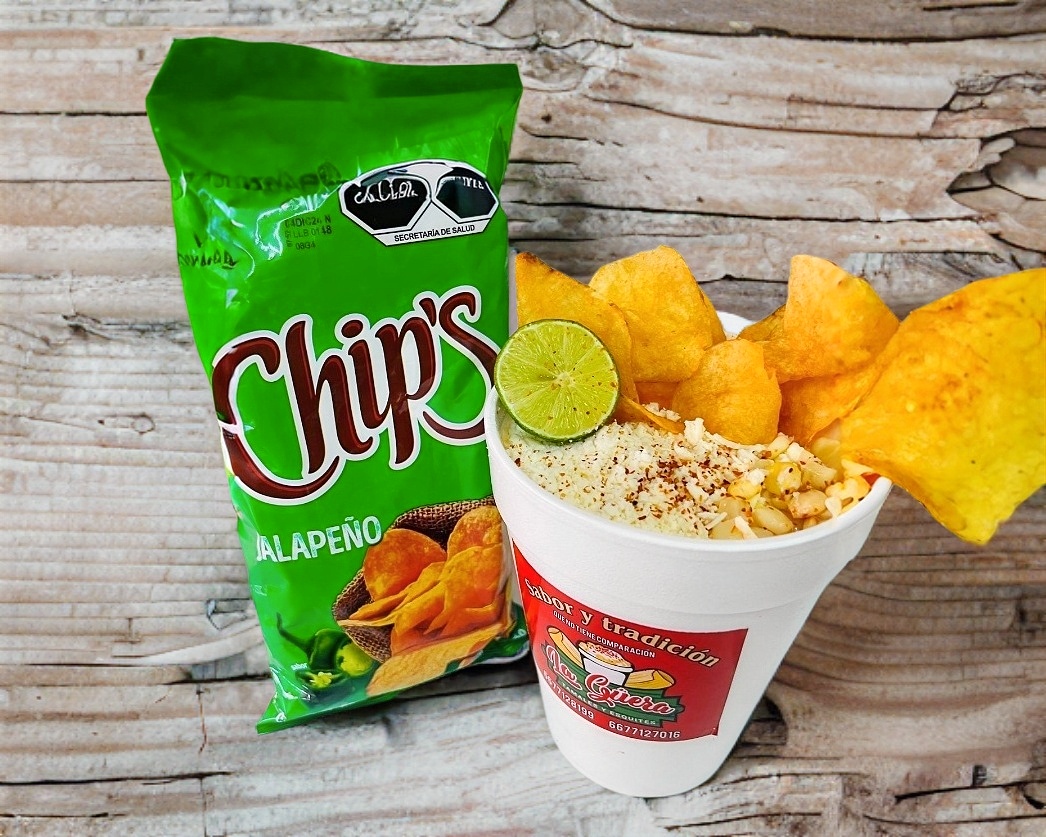 Chips jalapeño con Delicioso esquite, crema, queso o mayonesa y complementos empacados aparte como limón, salsa Guacamaya regular, salsa Guacamaya mix, chamoy, chile de árbol molido, cubiertos y servilletas.