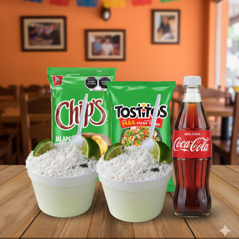 Dos Esquites 1/2 Litro + Dos Sabritas + Refresco 600 ml a elegir.
