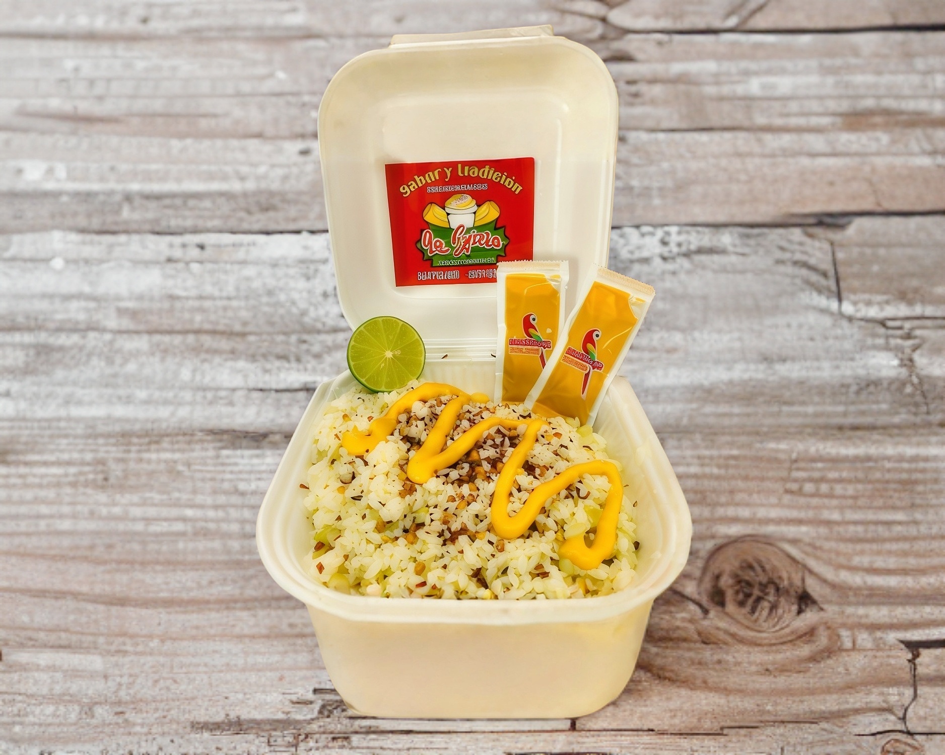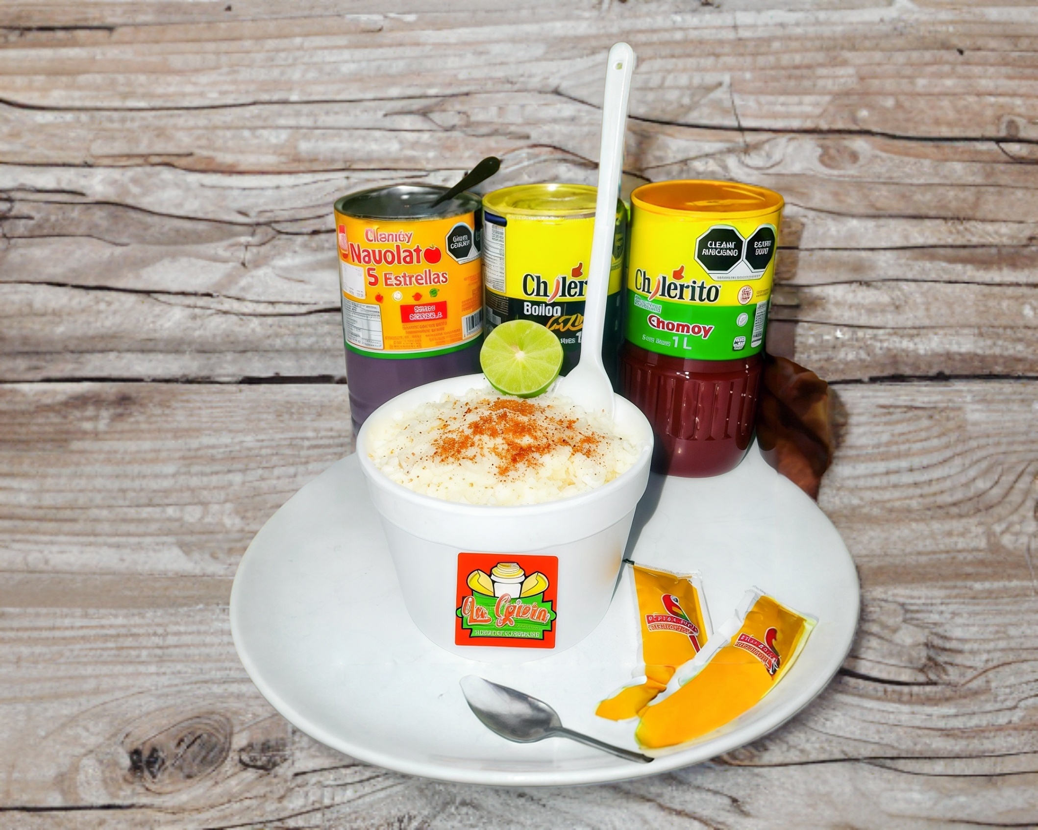 Delicioso esquite, crema, queso o mayonesa y complementos empacados aparte como limón, salsa Guacamaya regular, salsa Guacamaya mix, chamoy, chile de árbol molido, cubiertos y servilletas.