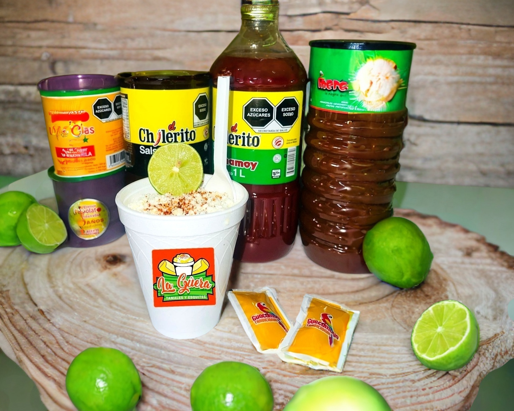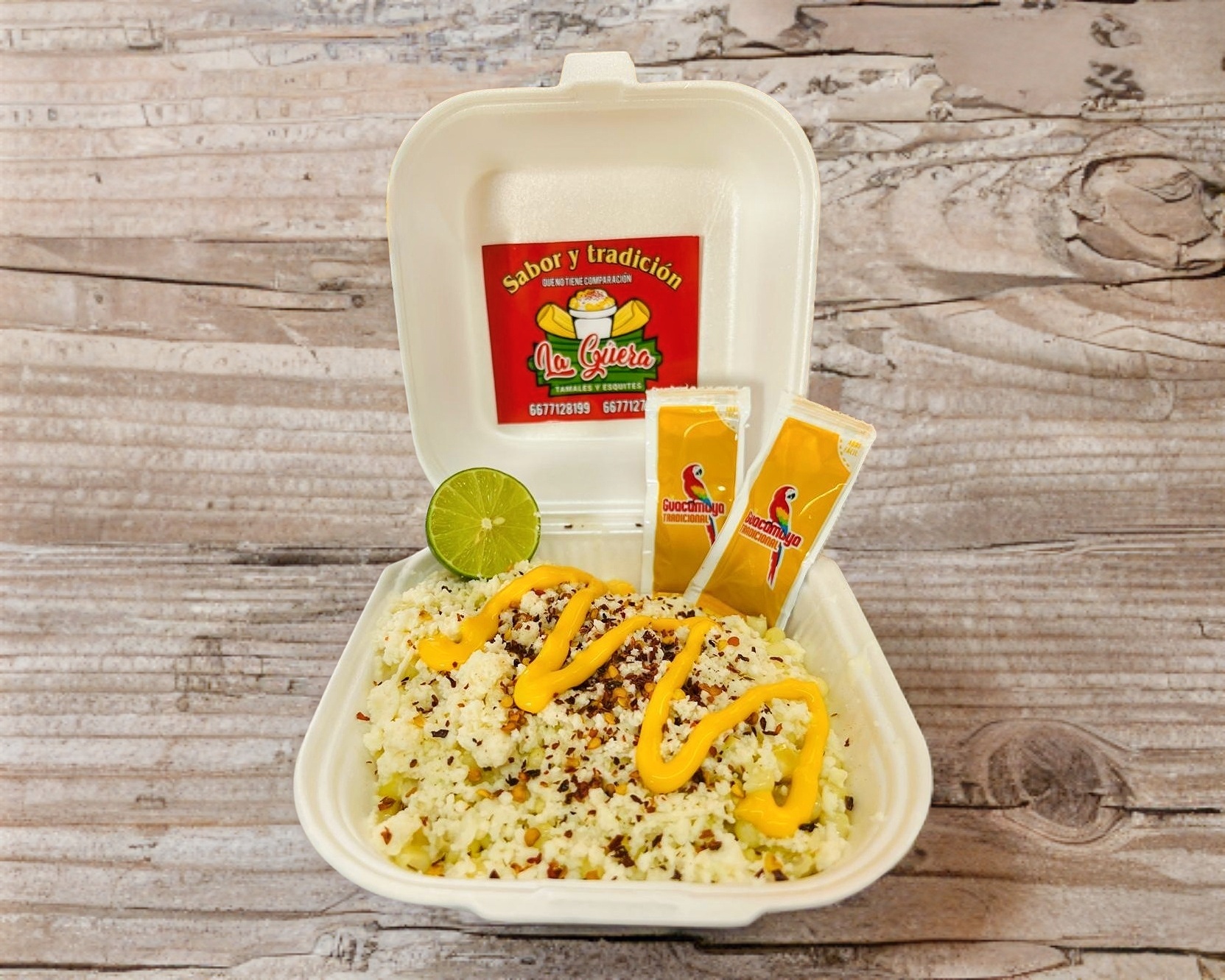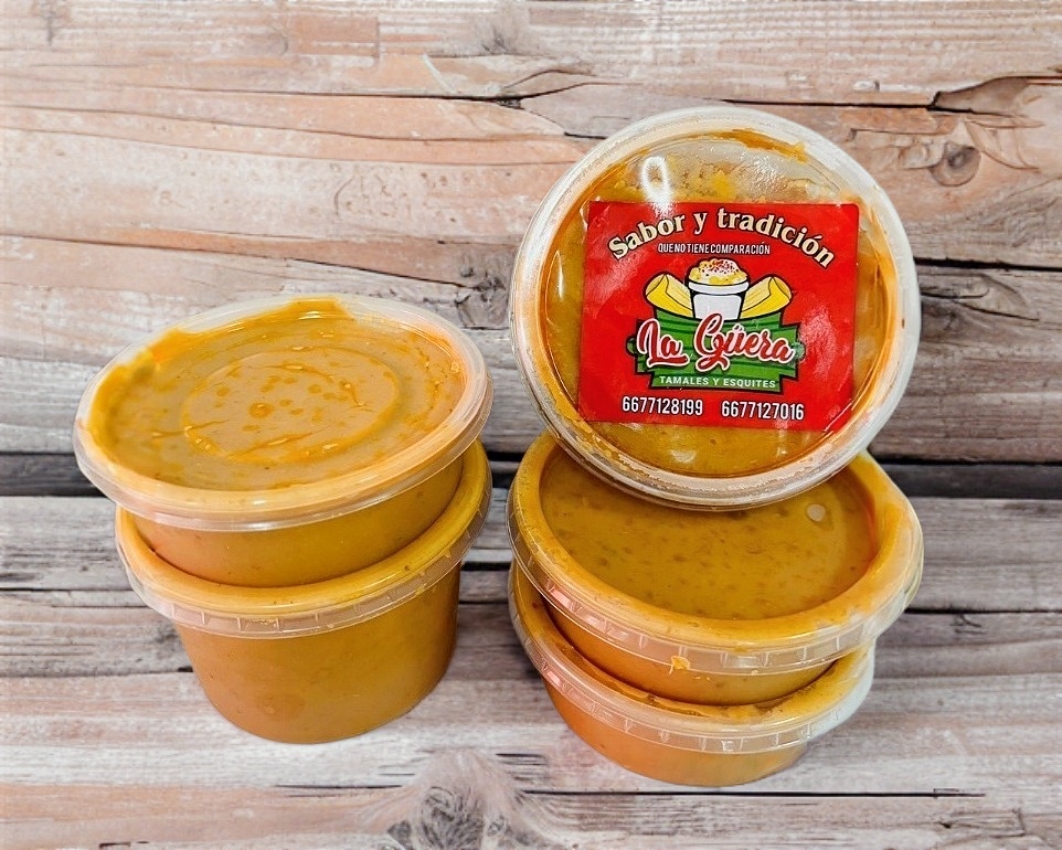 Tamal de elote, con delicioso esquite, crema, queso o mayonesa y complementos empacados aparte como limón, salsa Guacamaya regular, salsa Guacamaya negra, chamoy, chile de árbol molido, cubiertos, servilletas.