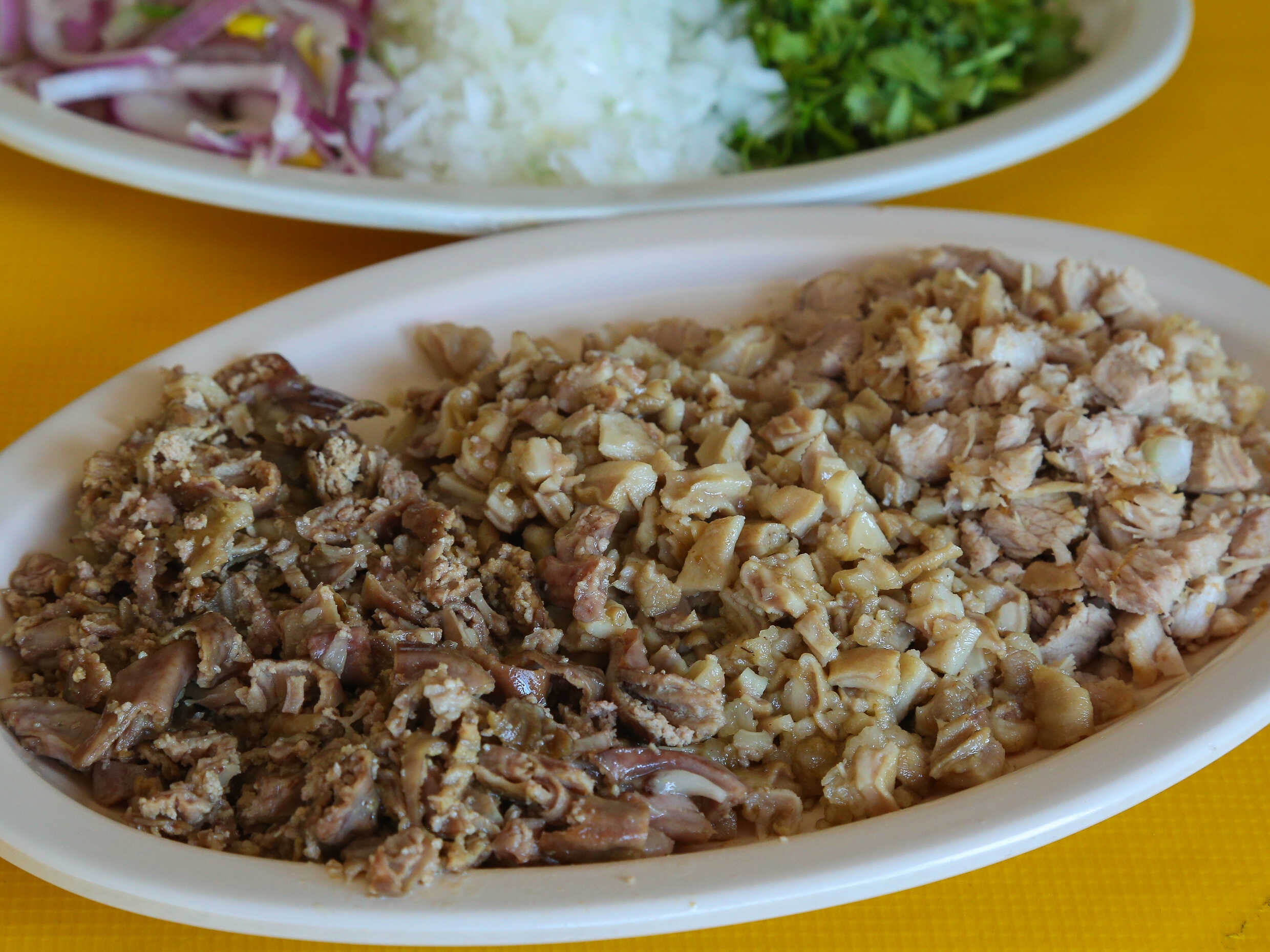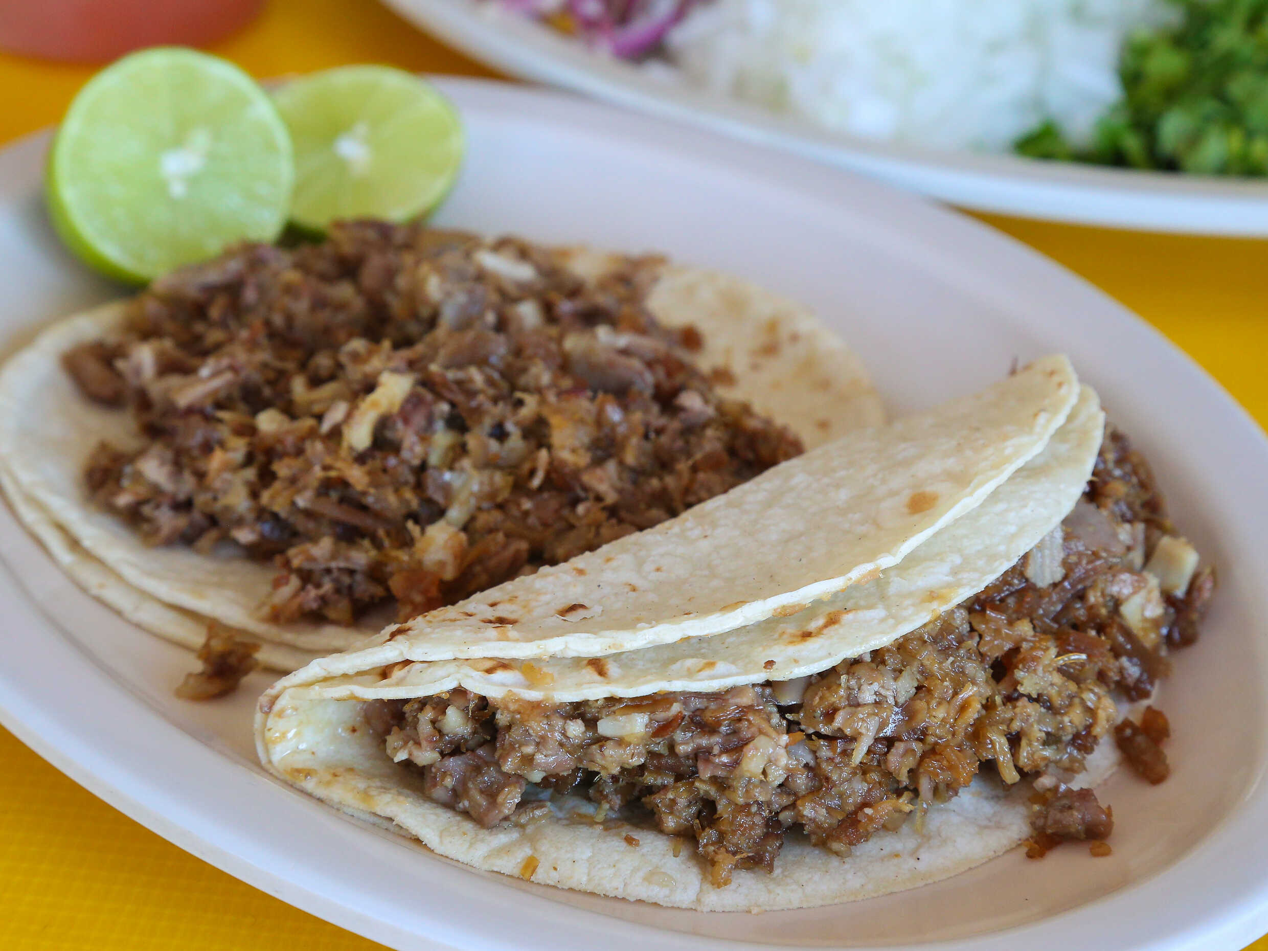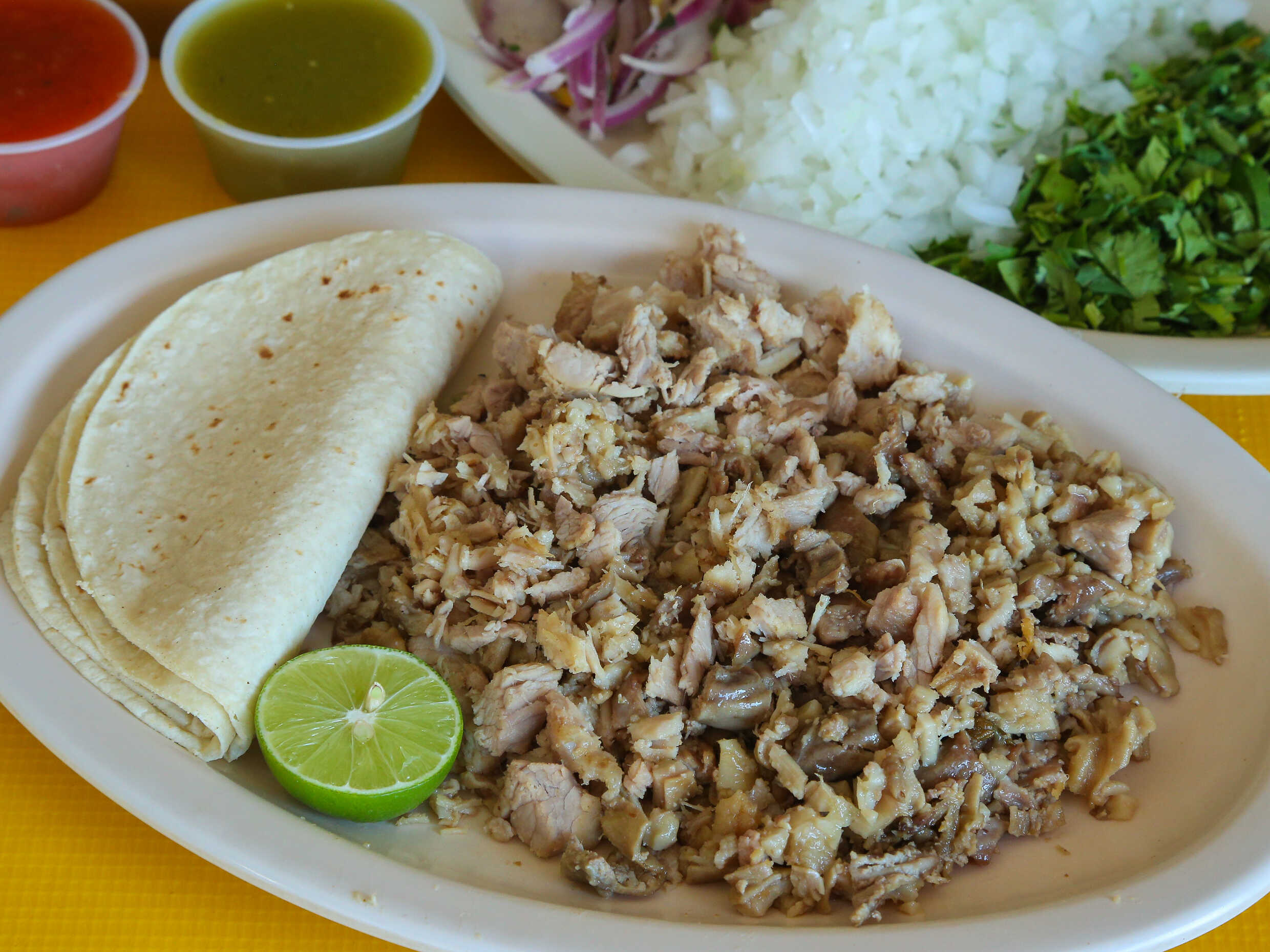 Se sirve con cebolla, cilantro, salsa y limón.