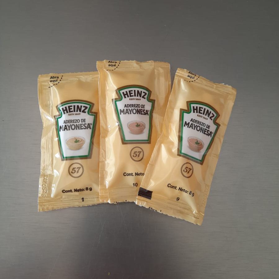 Tres sobres de mayonesa marca Heinz.