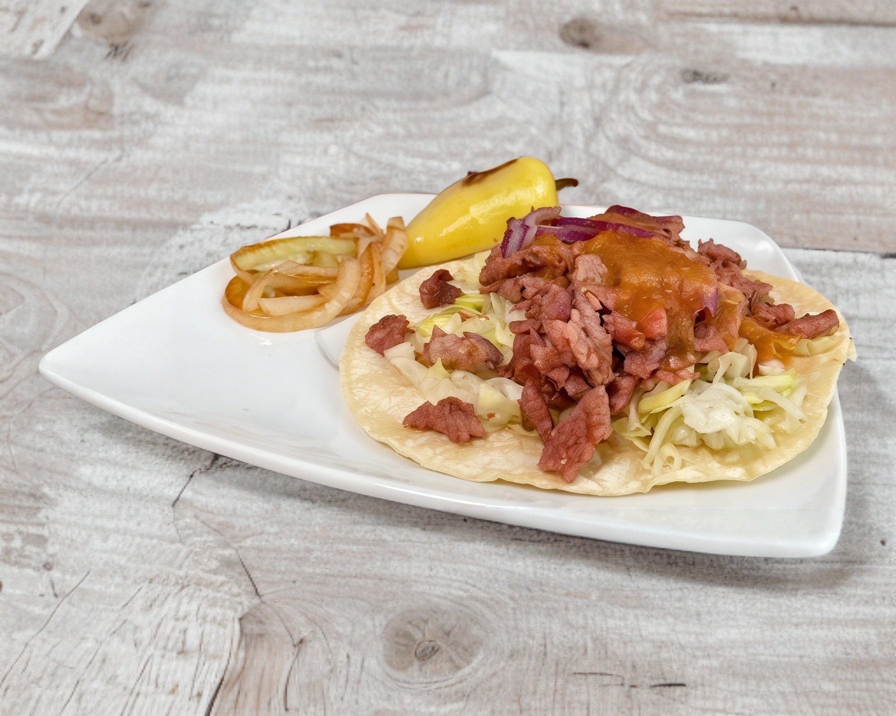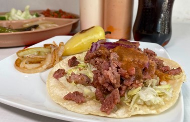 1 Taco con carne asada (individual), lechuga, cebolla morada, chiles y cebollas asadas, salsa verde picante, salsa bandera, limones y guacamole. Acompañantes por aparte.