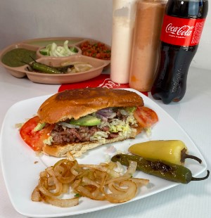 Torta con queso chihuahua carne asada y camarón, lechuga, cebolla morada, chiles y cebollas asadas, salsa verde picante y salsa bandera, limones y guacamole