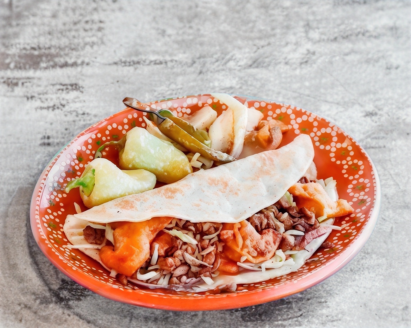 Doble tortilla de maiz dorada con queso chihuahua carne asada, lechuga, cebolla morada, chiles y cebollas asadas, salsa verde picante, salsa bandera, limones y guacamole