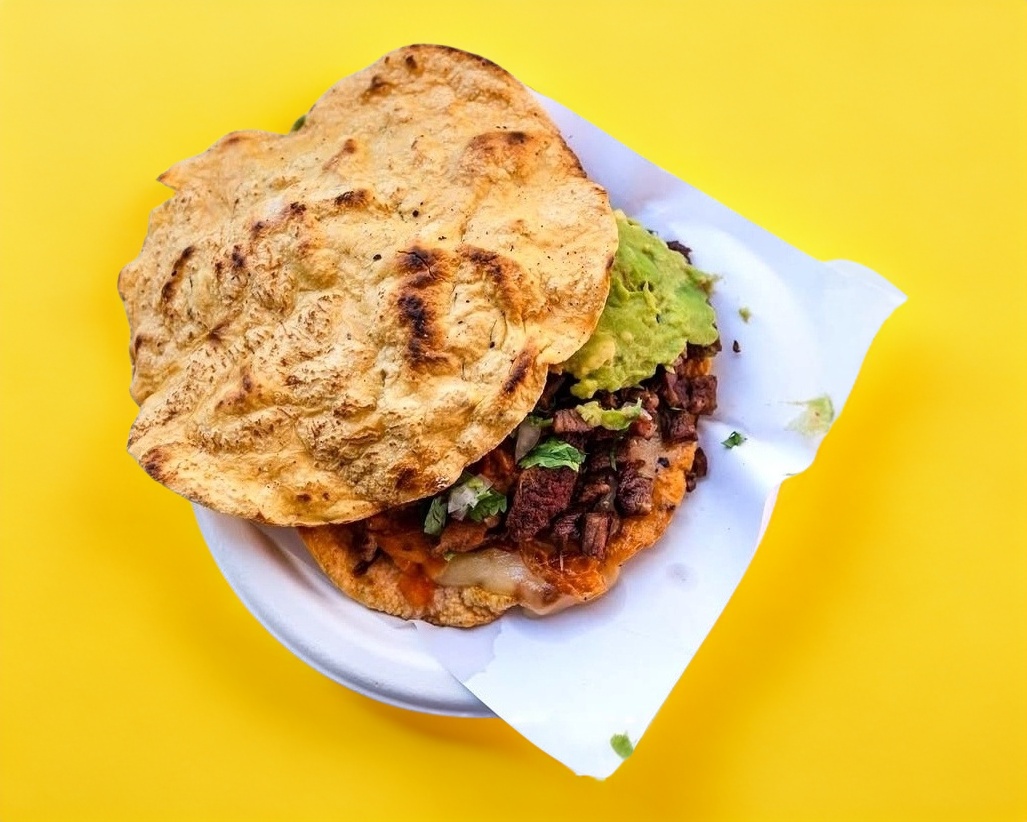 gordita extra grande con acientos queso y carne asada cebolla y lechuga