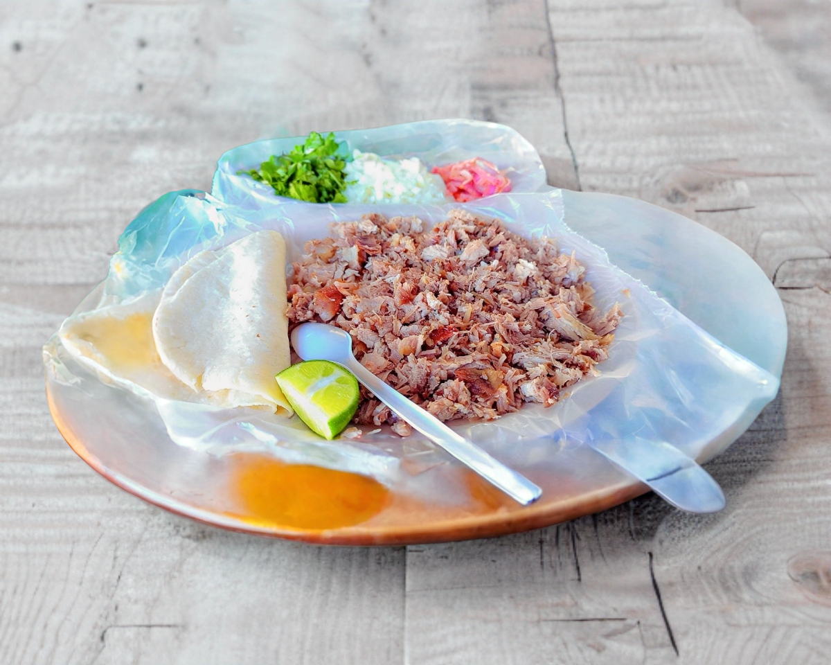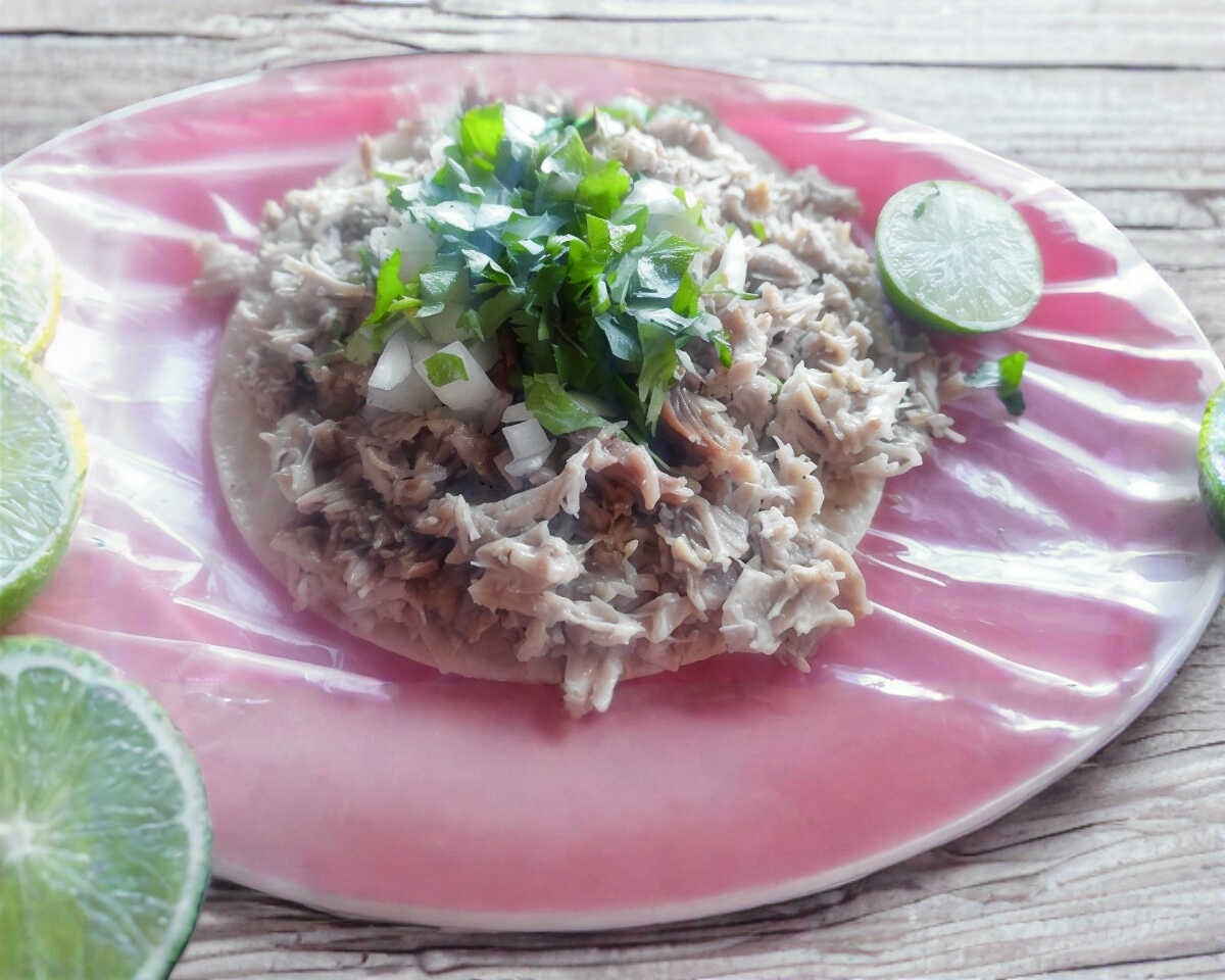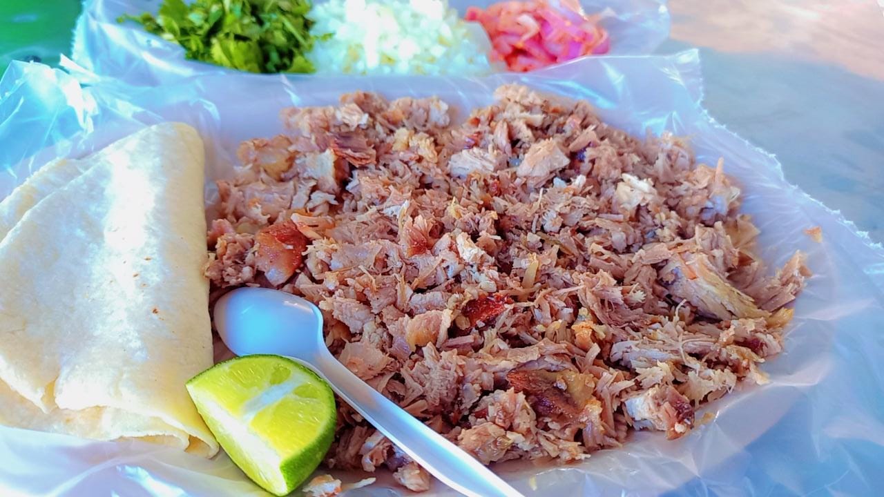 Taco de carnita dorado, carne y tortilla, acompañado de sus respectivas salsas, cebolla, cilantro y la especialidad de la casa cebolla encurtida picosa.