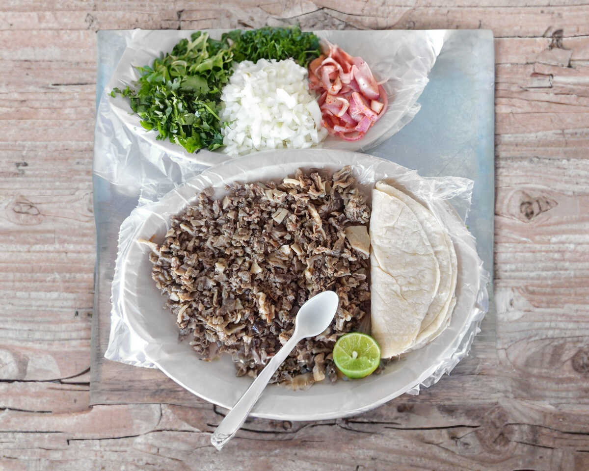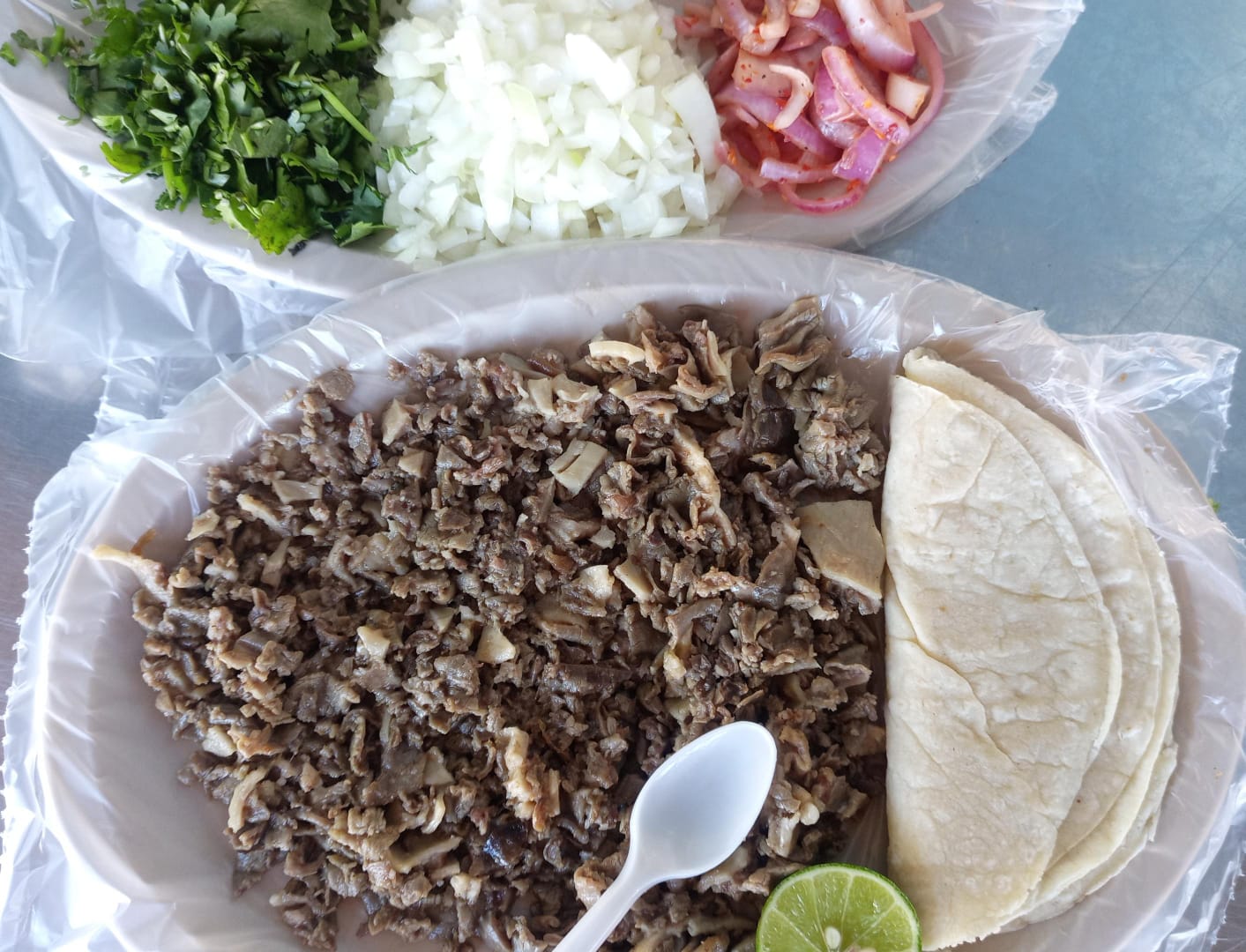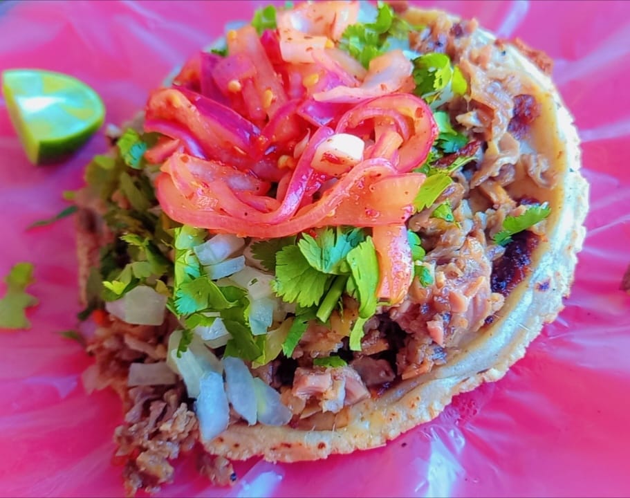 Carne acompañada de tortillas, salsa cebolla, cilantro y la especialidad de la casa cebolla curtida picosita.