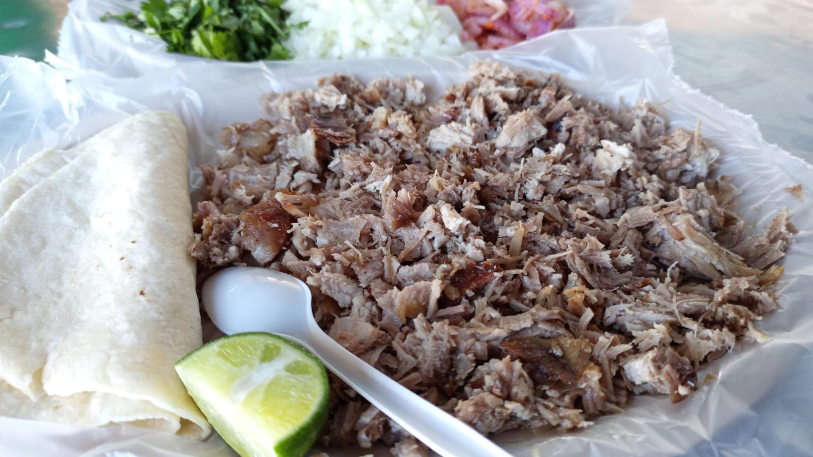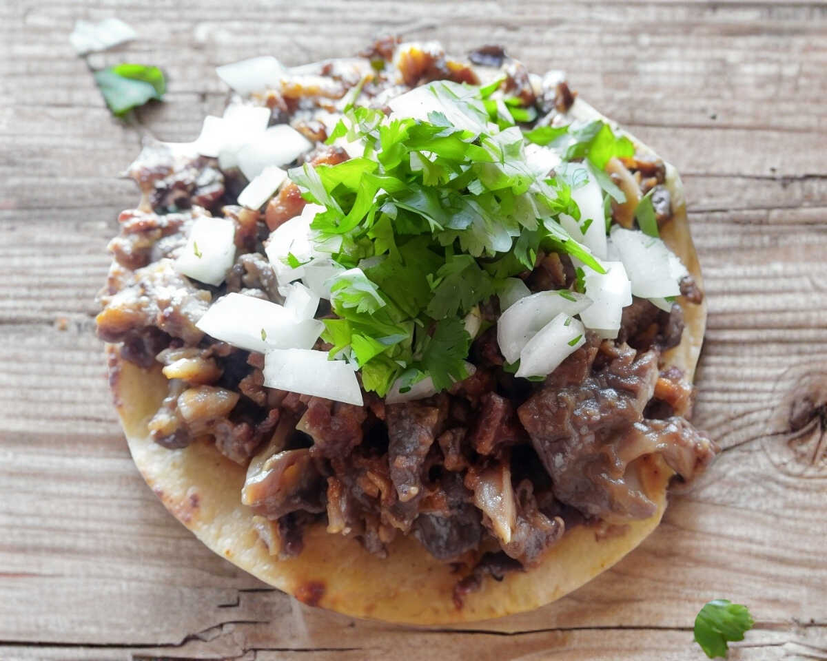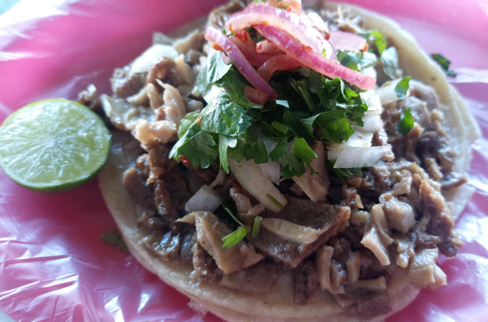 Carne acompañada de tortillas, salsa cebolla, cilantro y la especialidad de la casa cebolla curtida picosita.