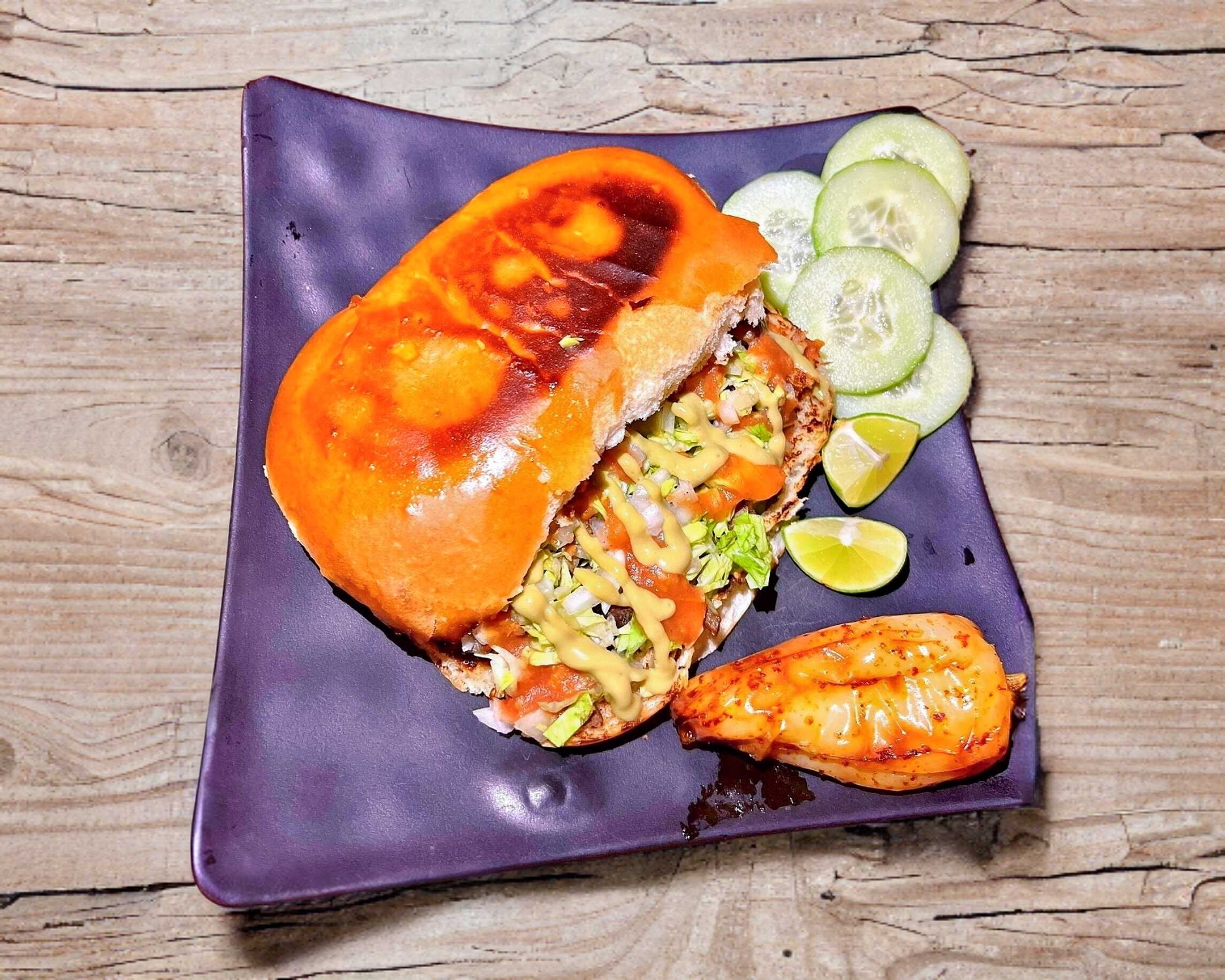 Pan telera, mayonesa, carne asada, cebolla morada, lechuga y jugo de tomate.