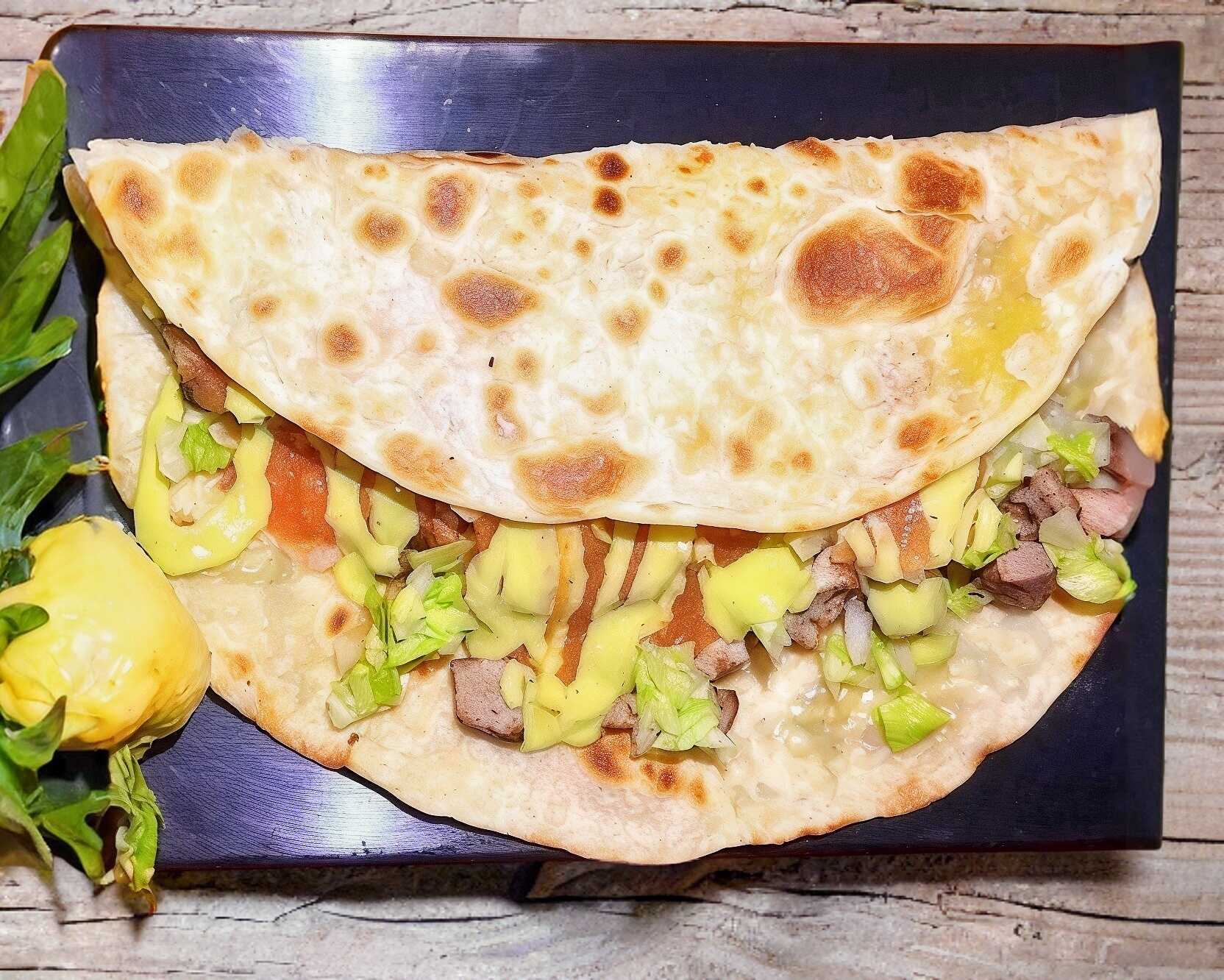 Tortilla de harina con queso, carne asada, cebolla morada, lechuga y jugo de tomate