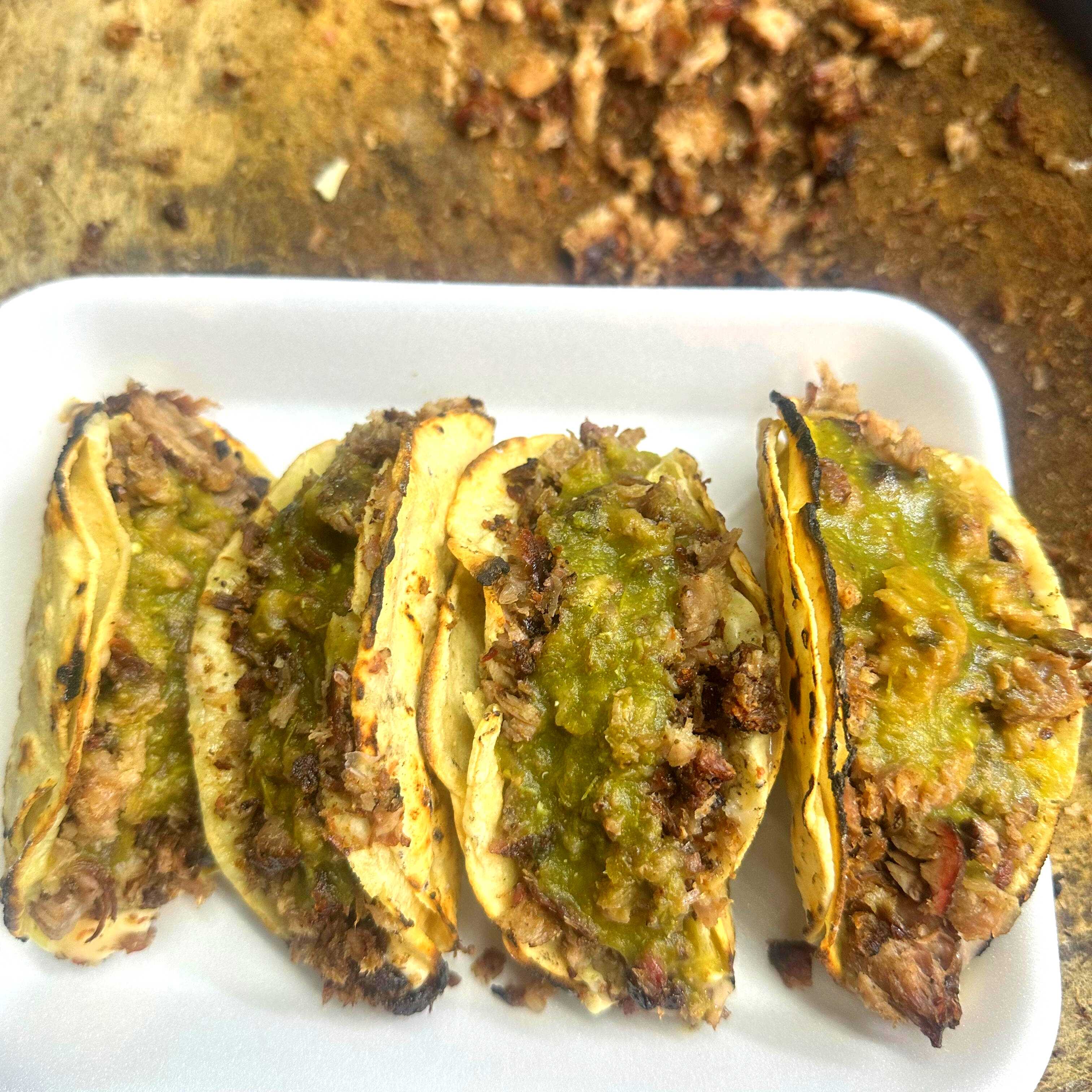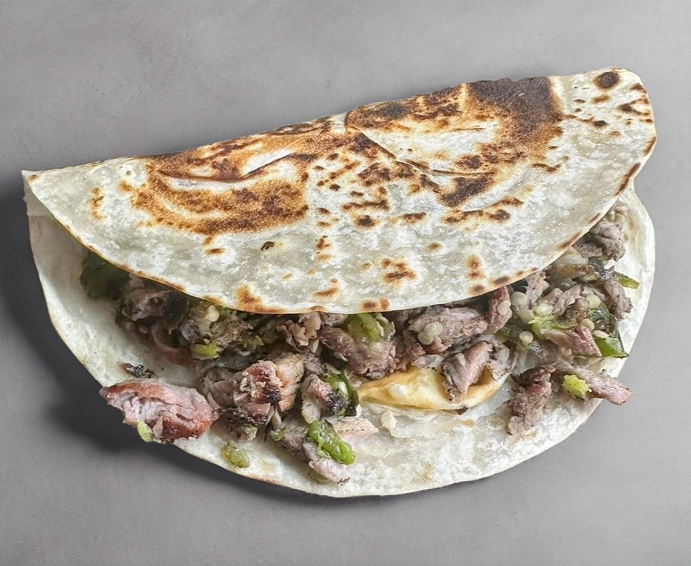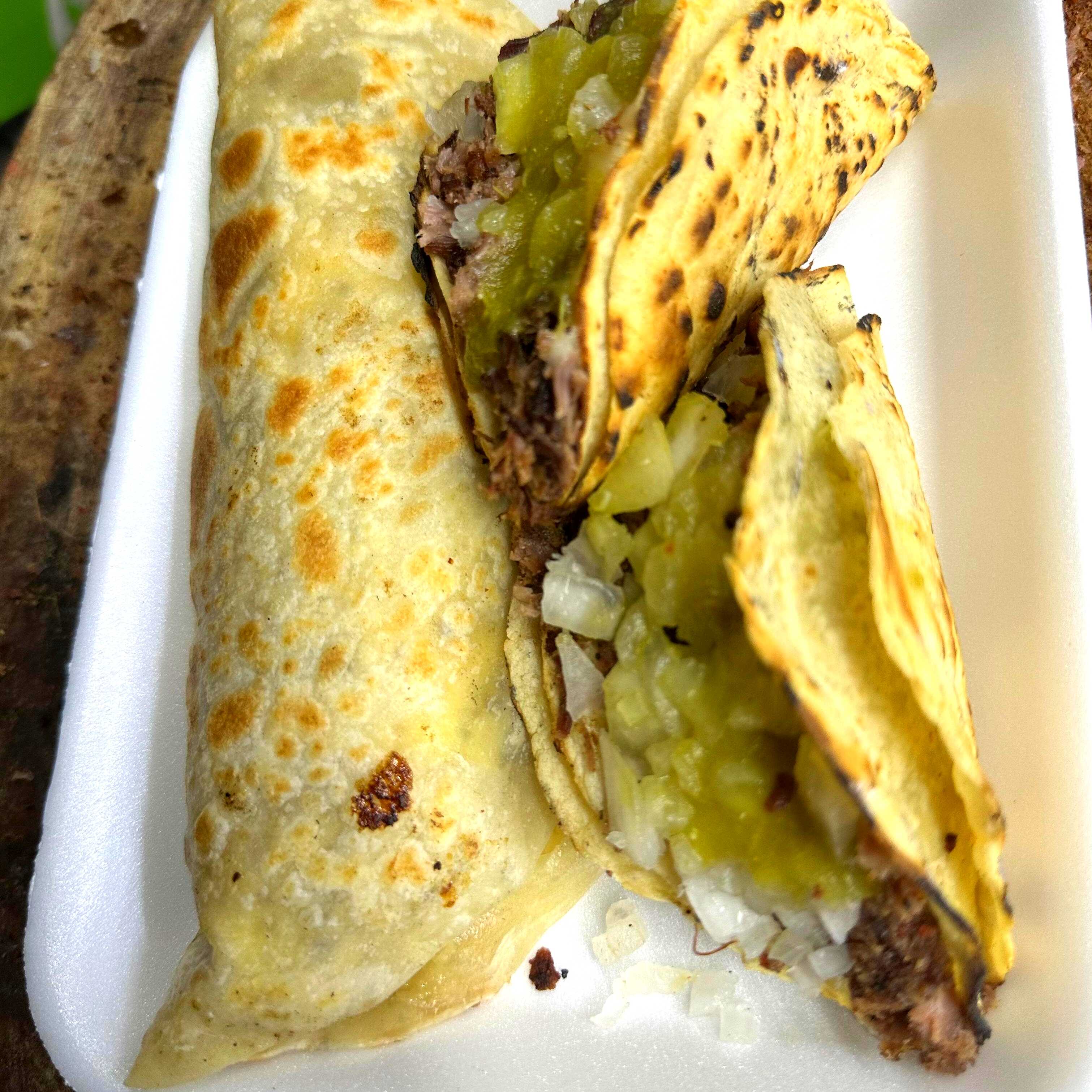 Tortilla de maíz doble con queso Chester, el taco es dorado a las brasas y es doblado