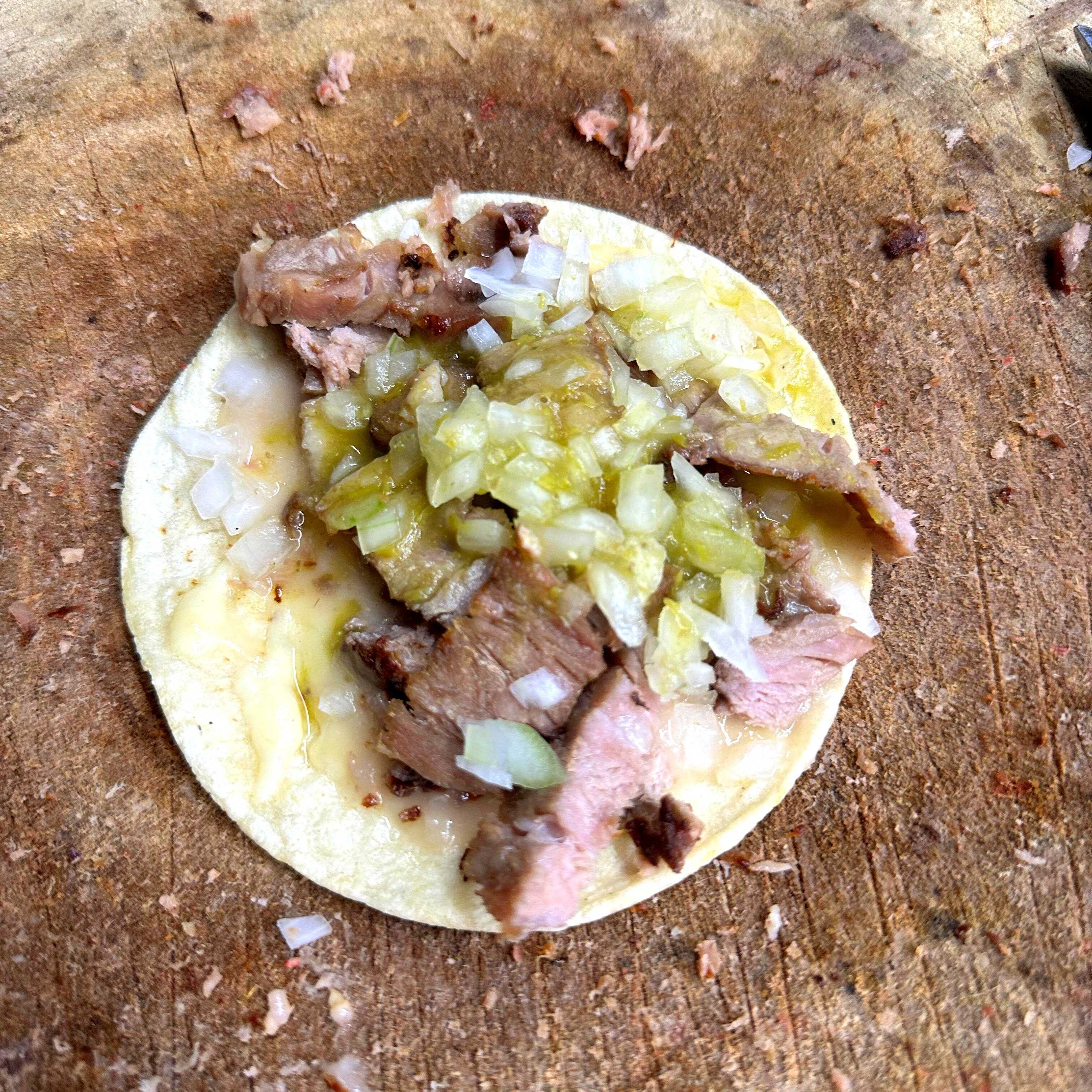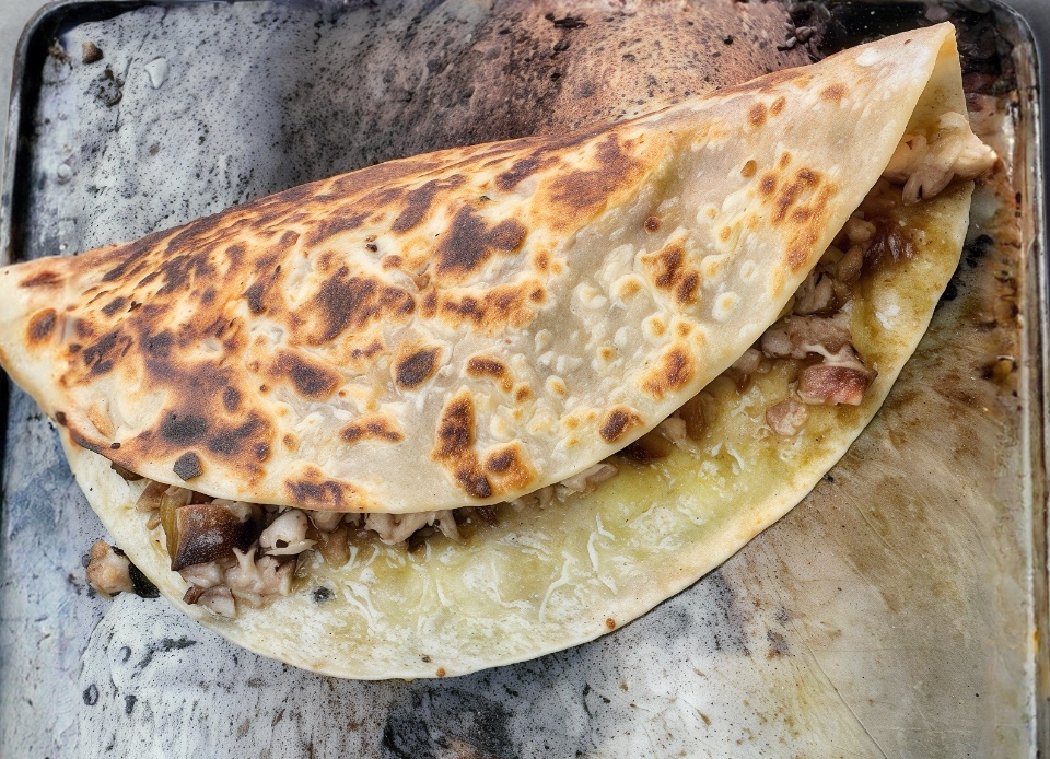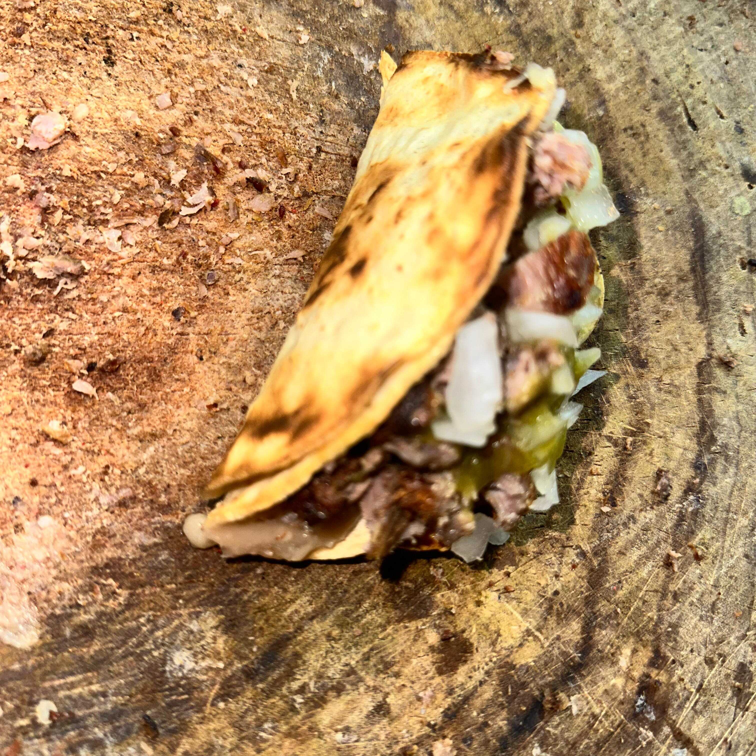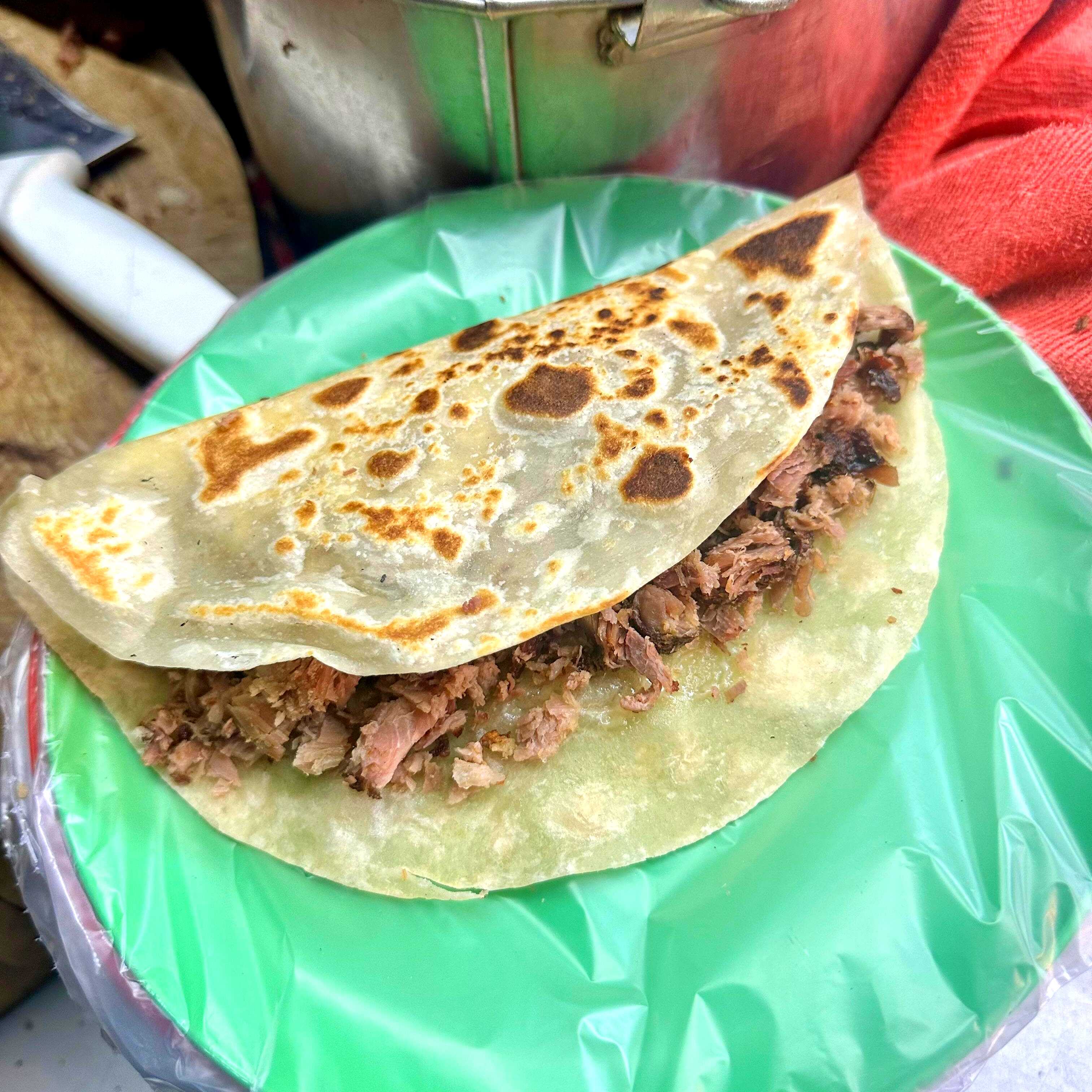 Tortilla de maíz doble con queso Chester, el taco es dorado a las brasas y es doblado