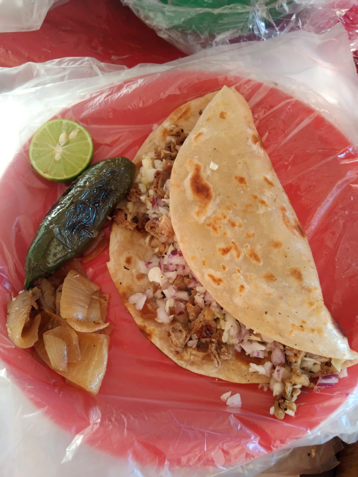 tortilla de maiz,carne adobada,repollo,cebolla blanca,salsa verde,salsa de tomate,cebolla asada,chile tatemado,limon e ingredientes extras