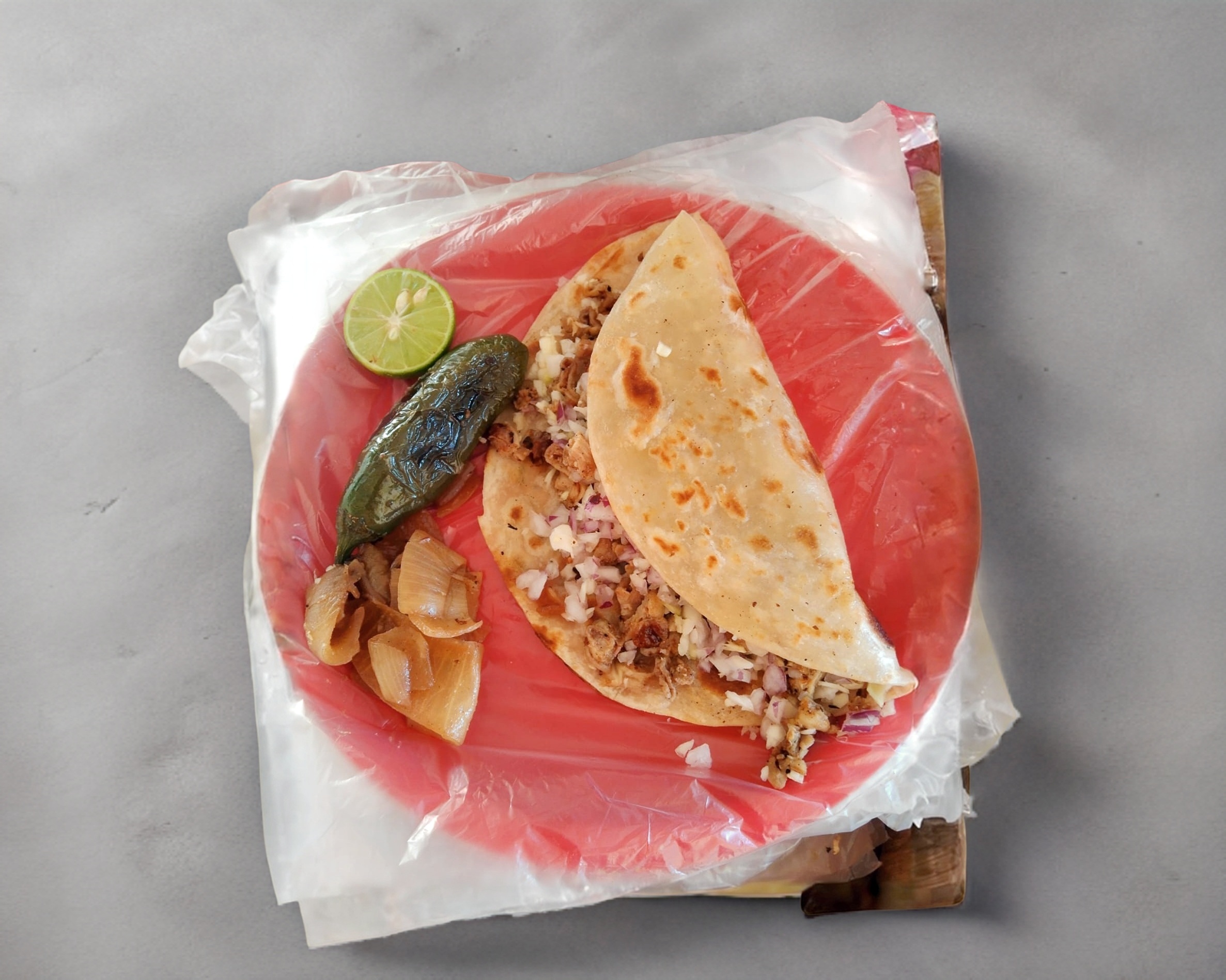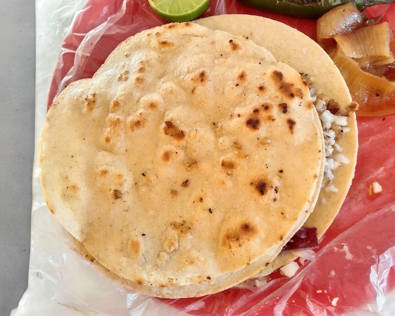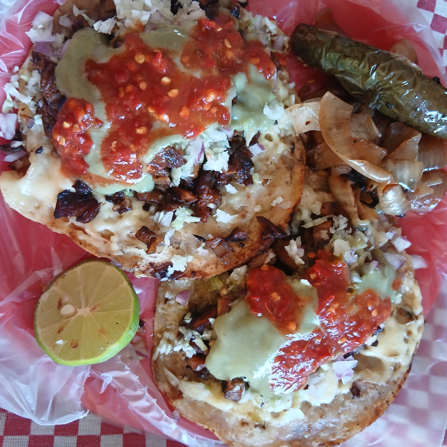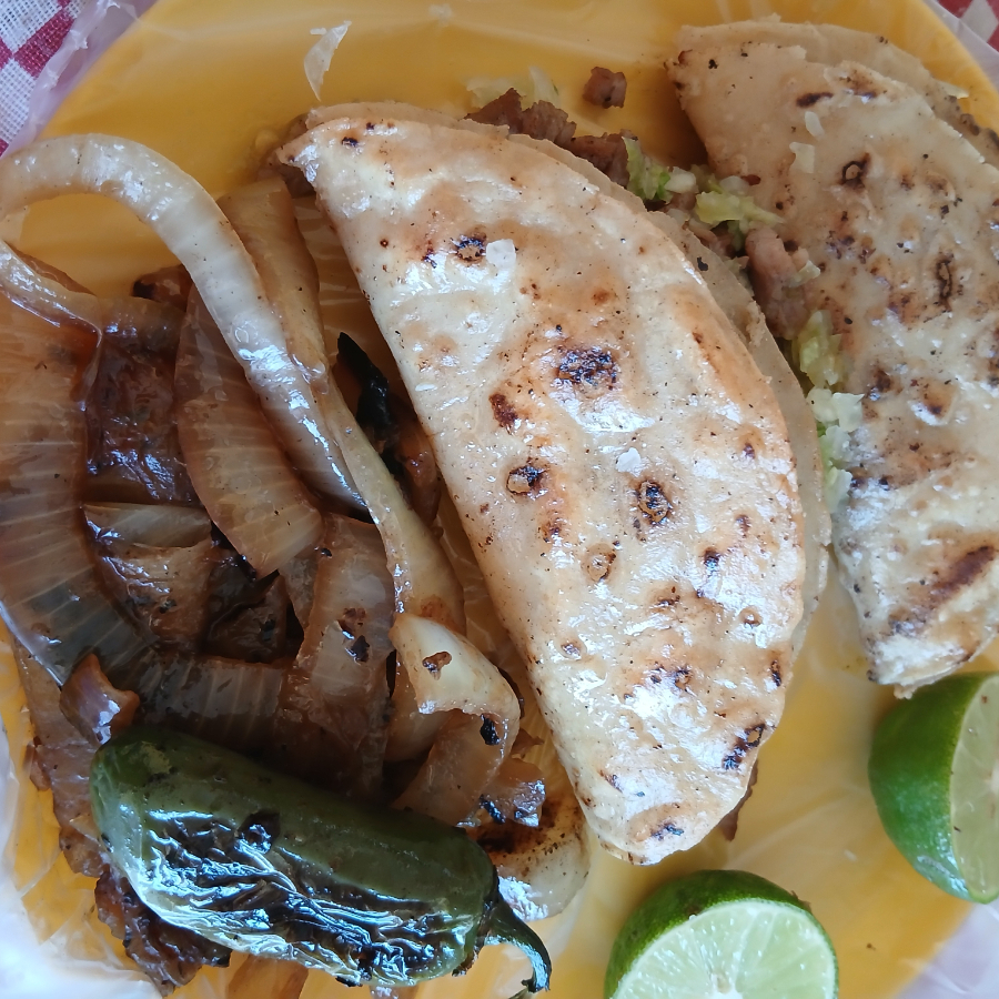tortilla doble doradas con queso, carne adobada,repollo,cebolla blanca,salsa verde,salsa de tomate,cebolla asada,chile tatemado limon e ingredientes extras.
