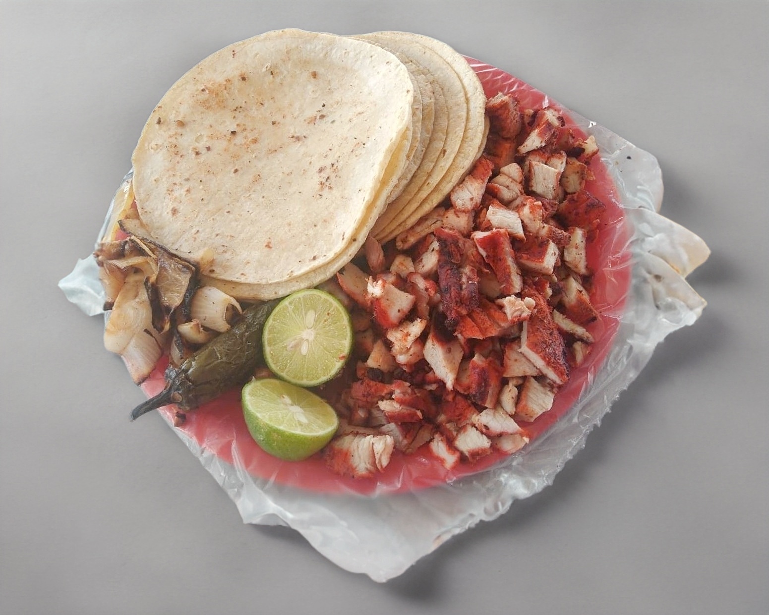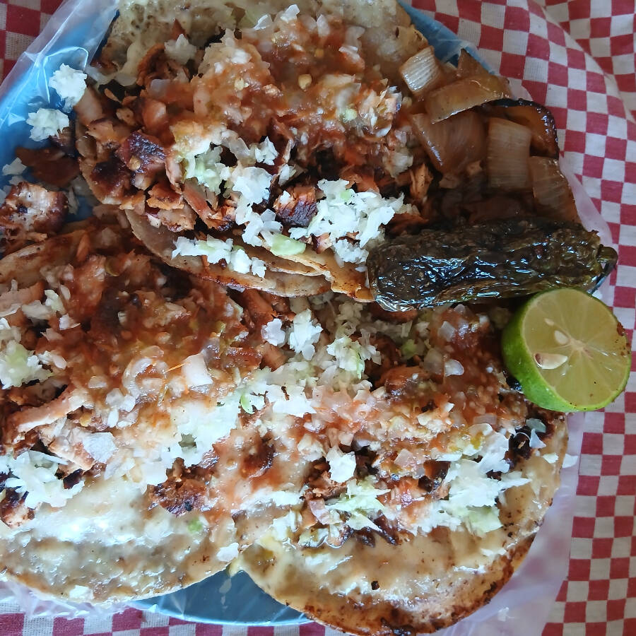 tortillas de maiz, carne adobada,repollo,cebolla blanca,salsa verde,salsa de tomate,cebolla asada,chile tatemado,limon e ingredientes extras
