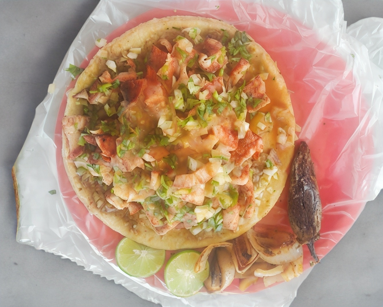 tortilla de maiz grande con queso y asiento,carne adobada,repollo,cebolla blanca,salsa verde,salsa de tomate,cebolla blanca,chile tatemado,limon e ingredientes extra.