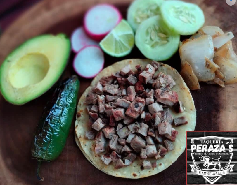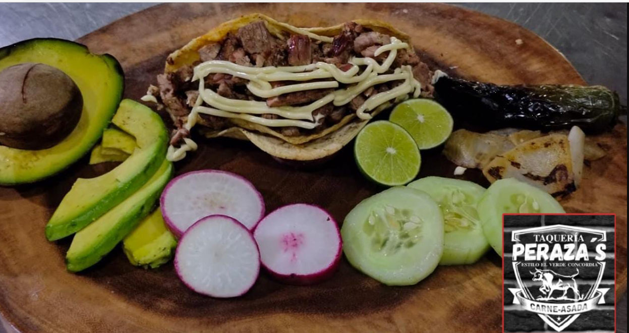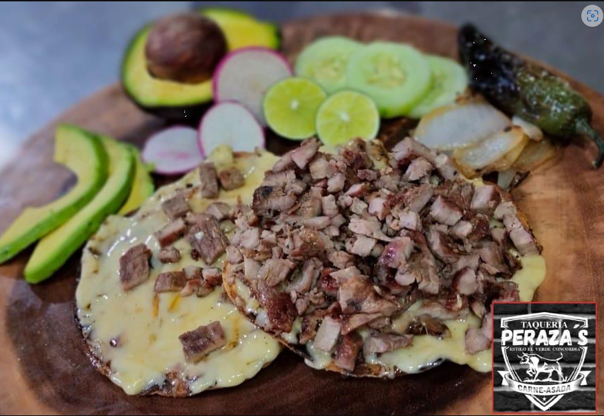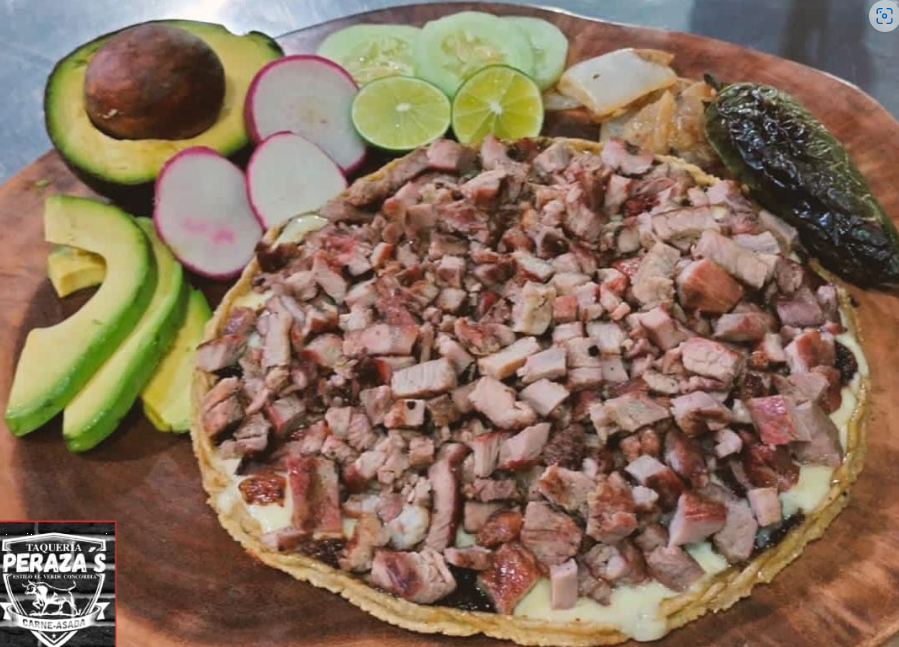 Tortilla dorada con queso chihuagua, carne asada, lechuga, cebolla, jugo de tomate y picante.