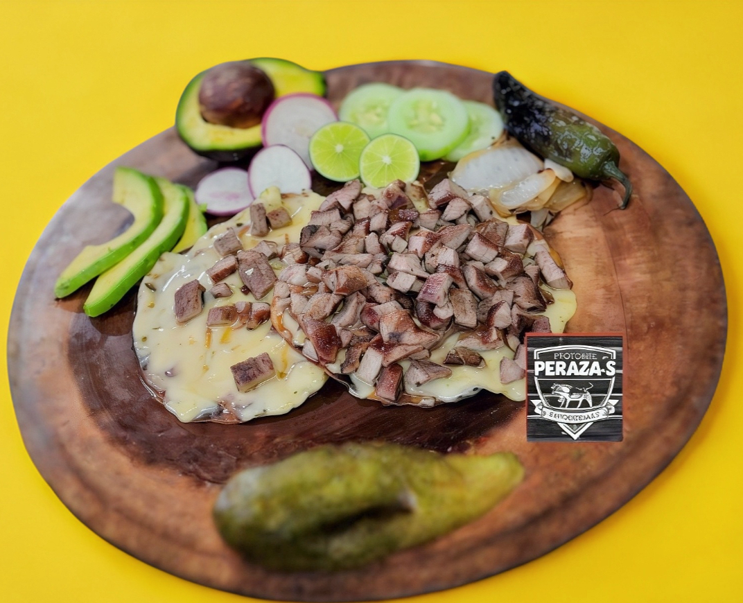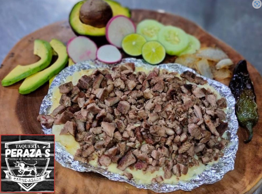 Papa cocida con mantequilla, queso chihuahua, carne asada, acompañadas con tortillas y verdura. Para 2 personas.