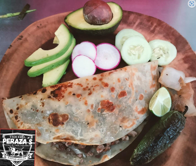 Tortilla de harina con queso chihuagua, carne asada, lechuga, cebolla, jugo de tomate y picante.
