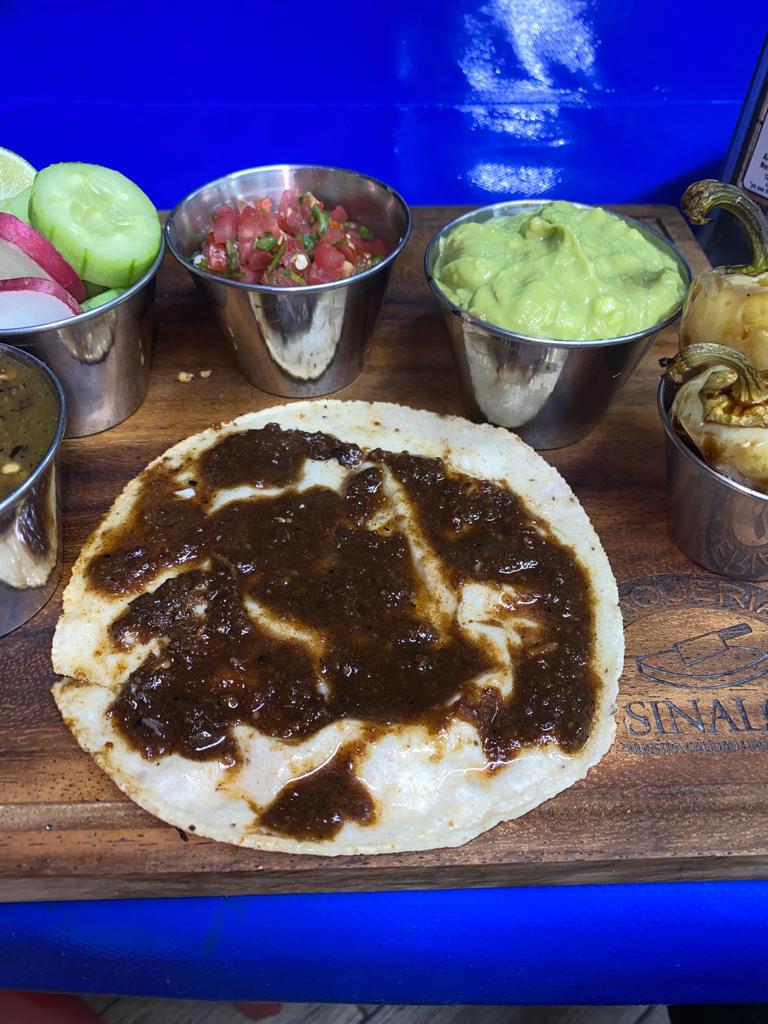 Tortilla de maíz con carne adobada.