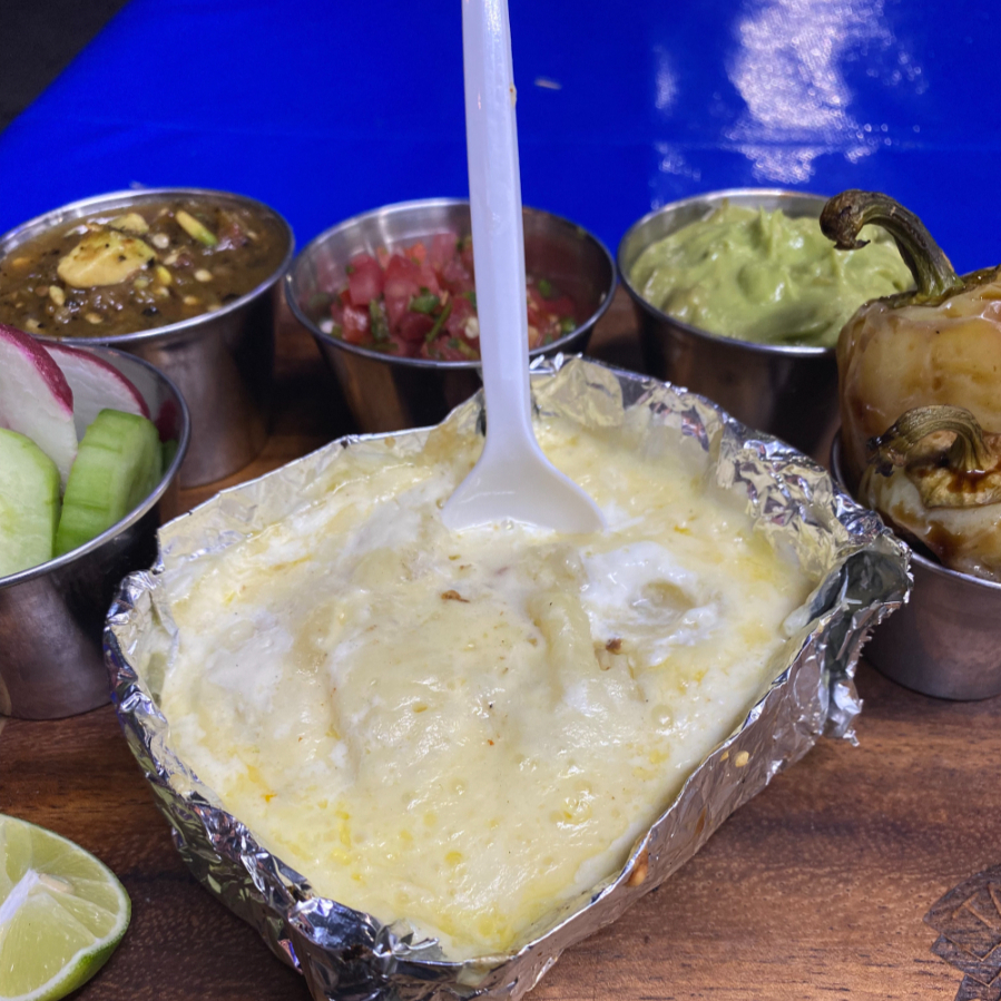 Rica combinación de puré de papa, queso, mantequilla, crema y carne asada acompañada con 4 tortillas blanditas de maíz y 2 doradas.