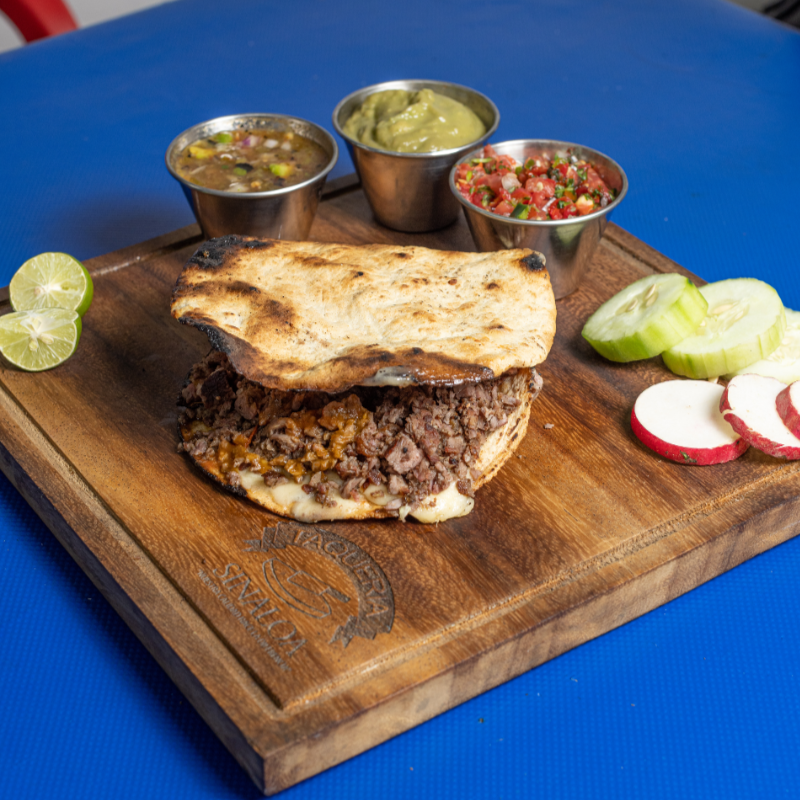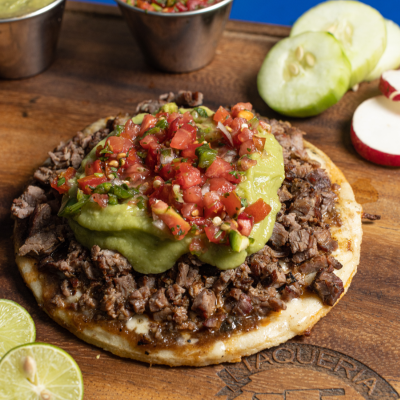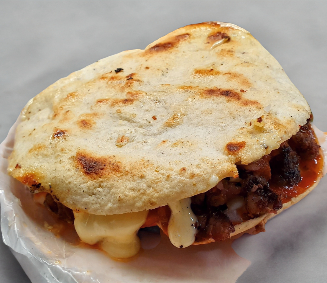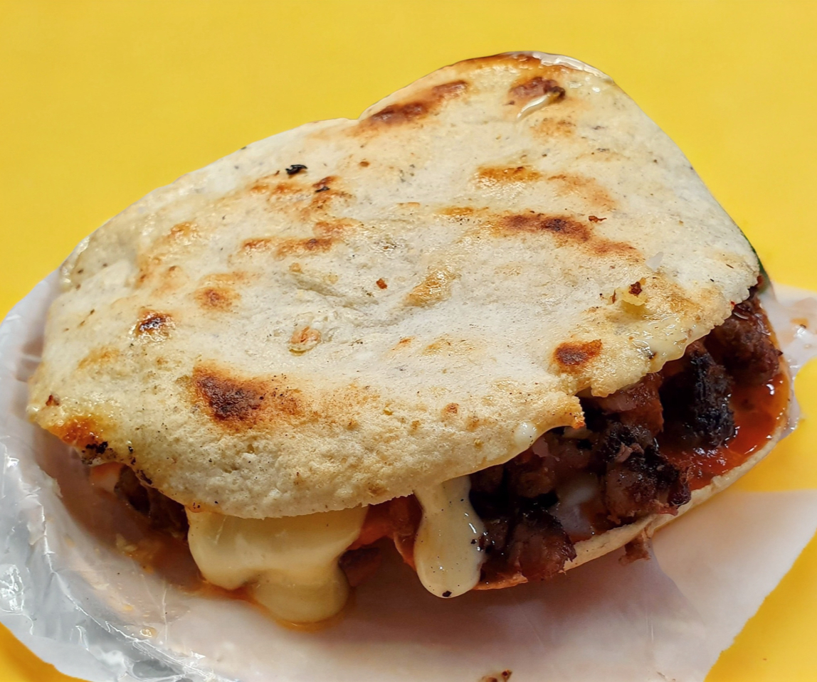 Gordita de maíz con asientos, queso y carne asada.