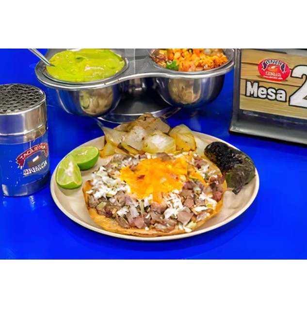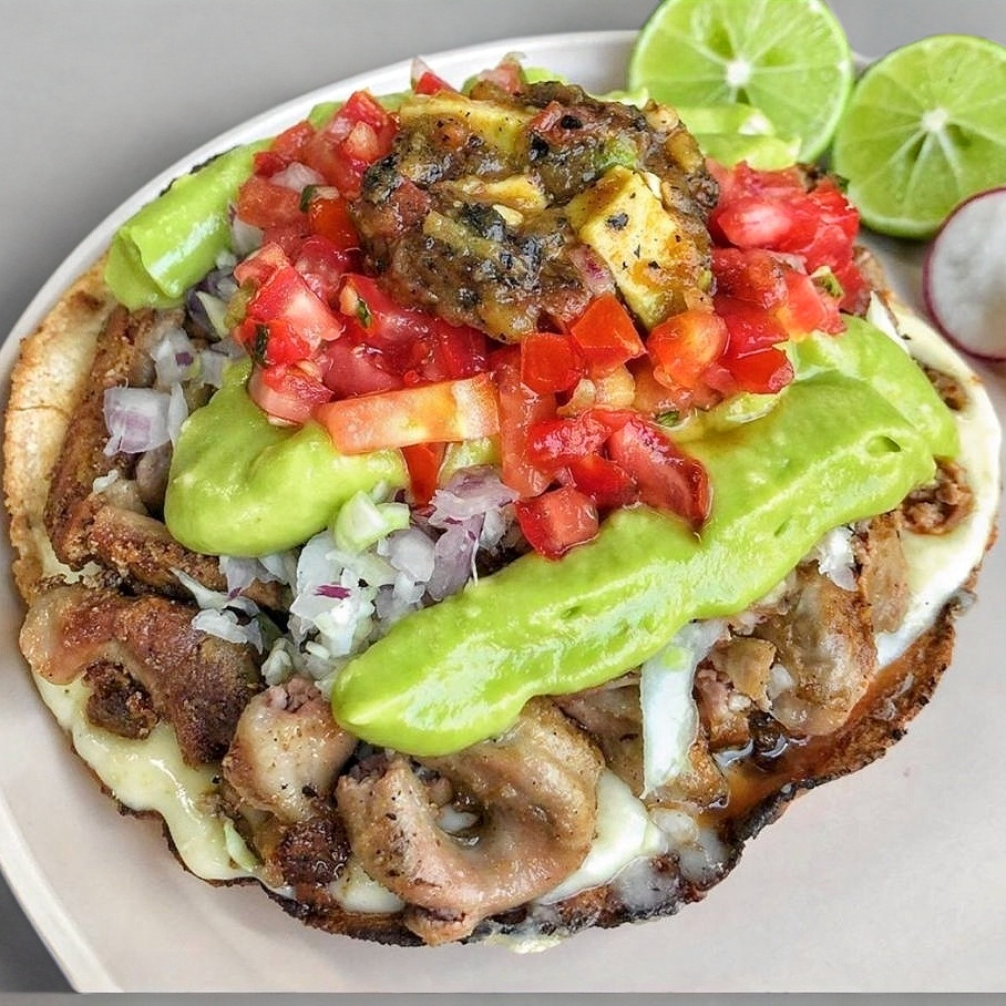Gordita de maíz con asientos, queso y carne adobada.
