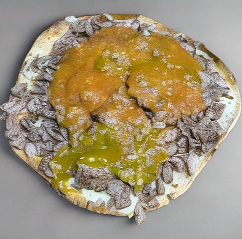 2 Tortillas de maíz doradas una sobre otra con queso y tripa.