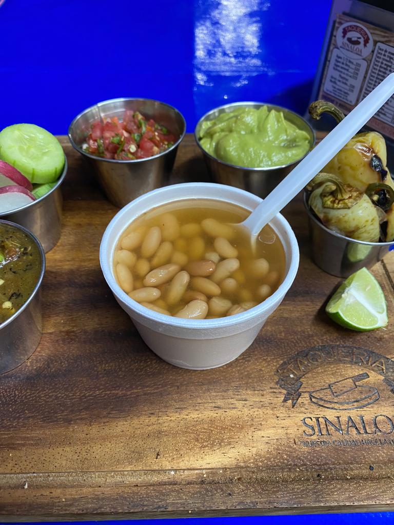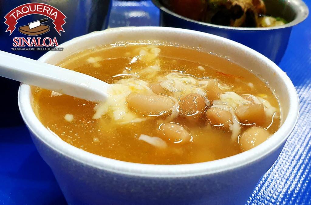 1/4 de frijol de la olla con una porción de queso y carne asada.