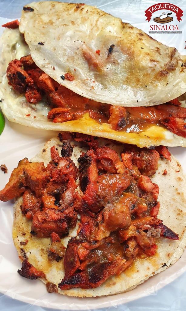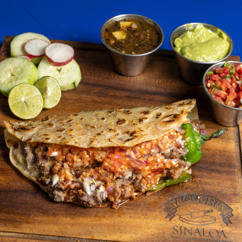 Tortilla de maíz dorada con queso y carne adobada.