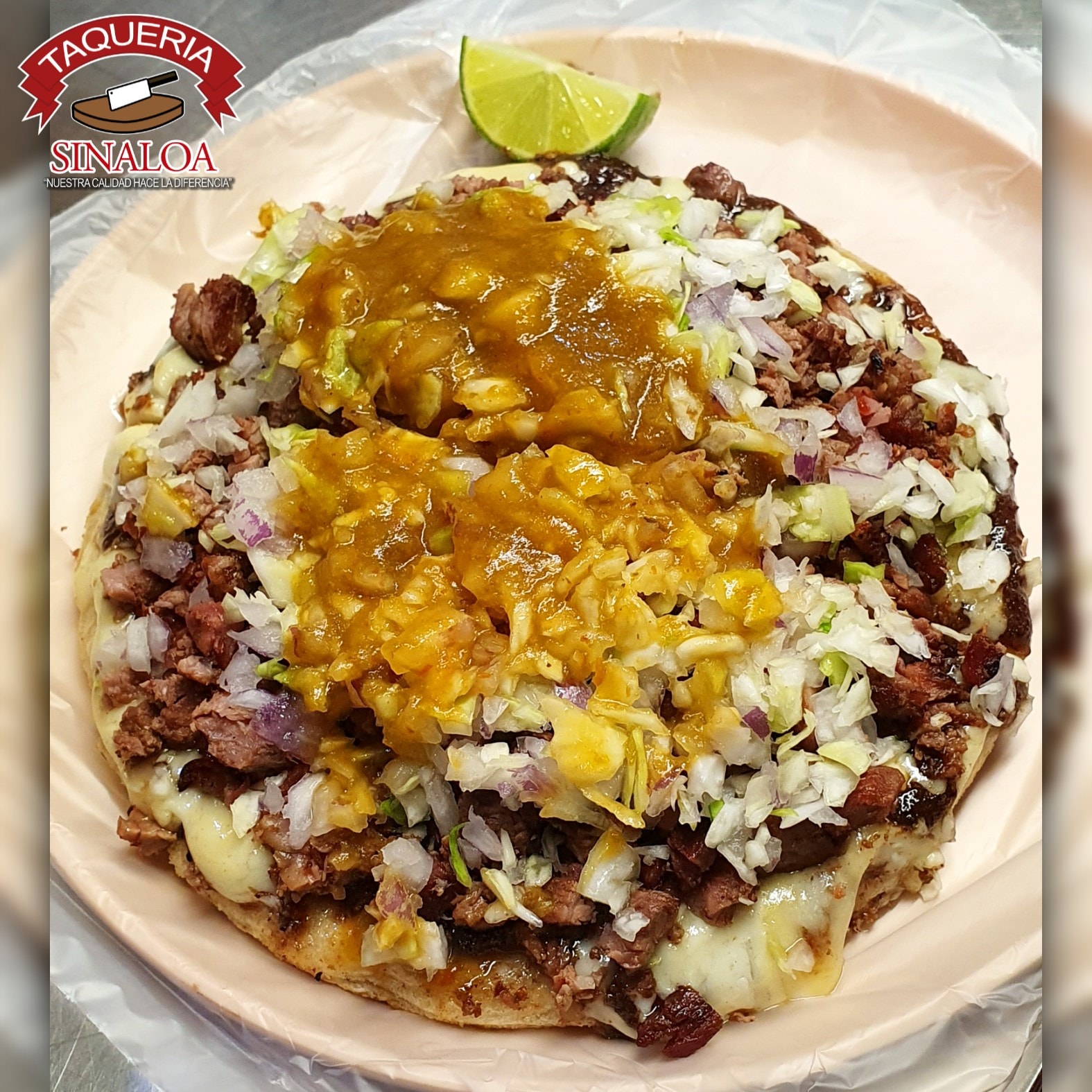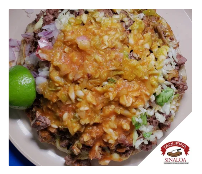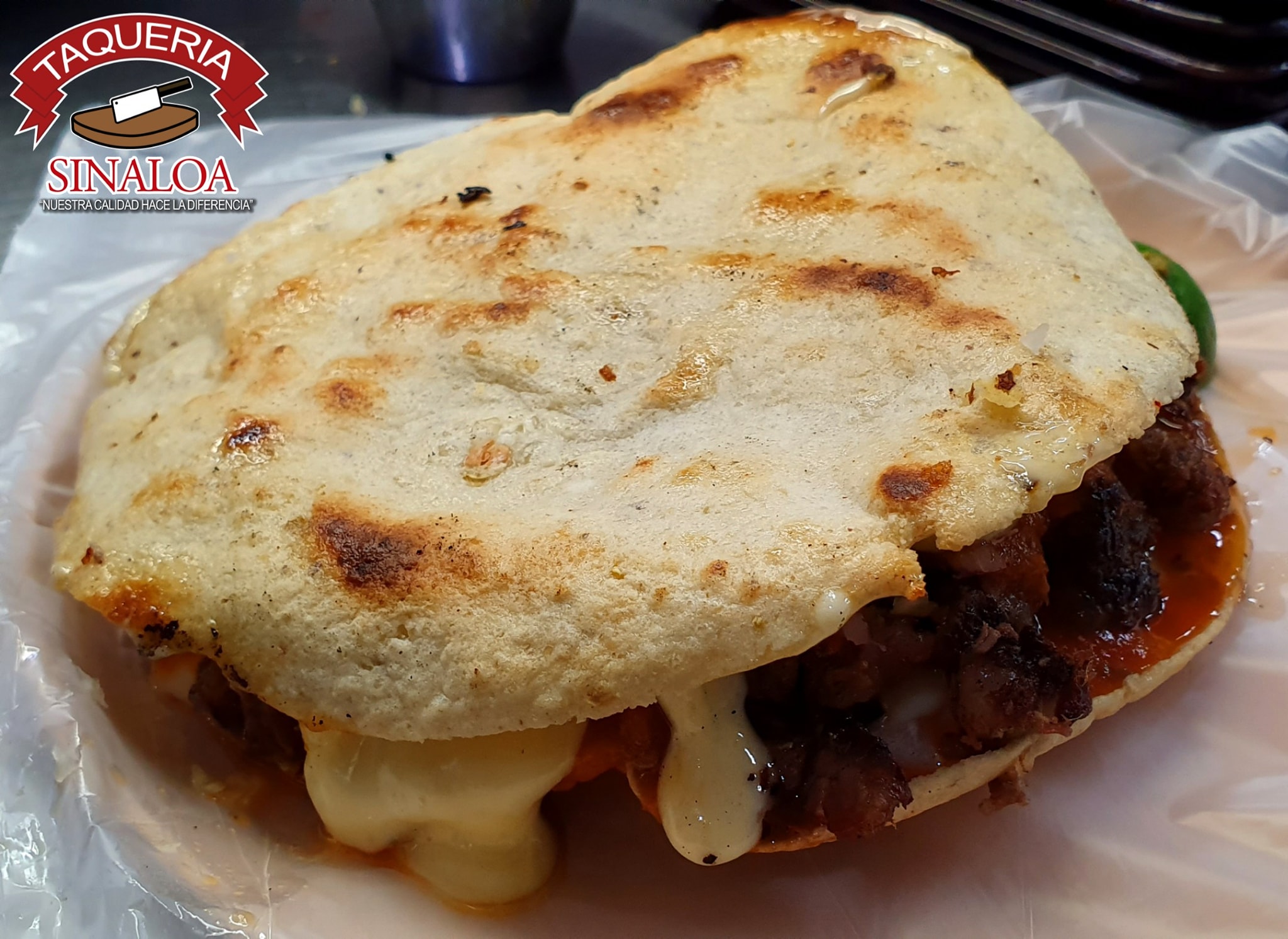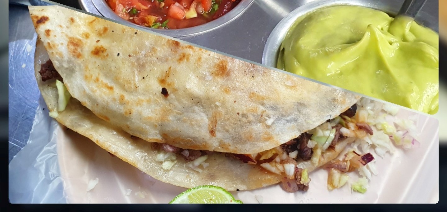 Tortilla de maíz dorada con queso, carne asada y tripa.