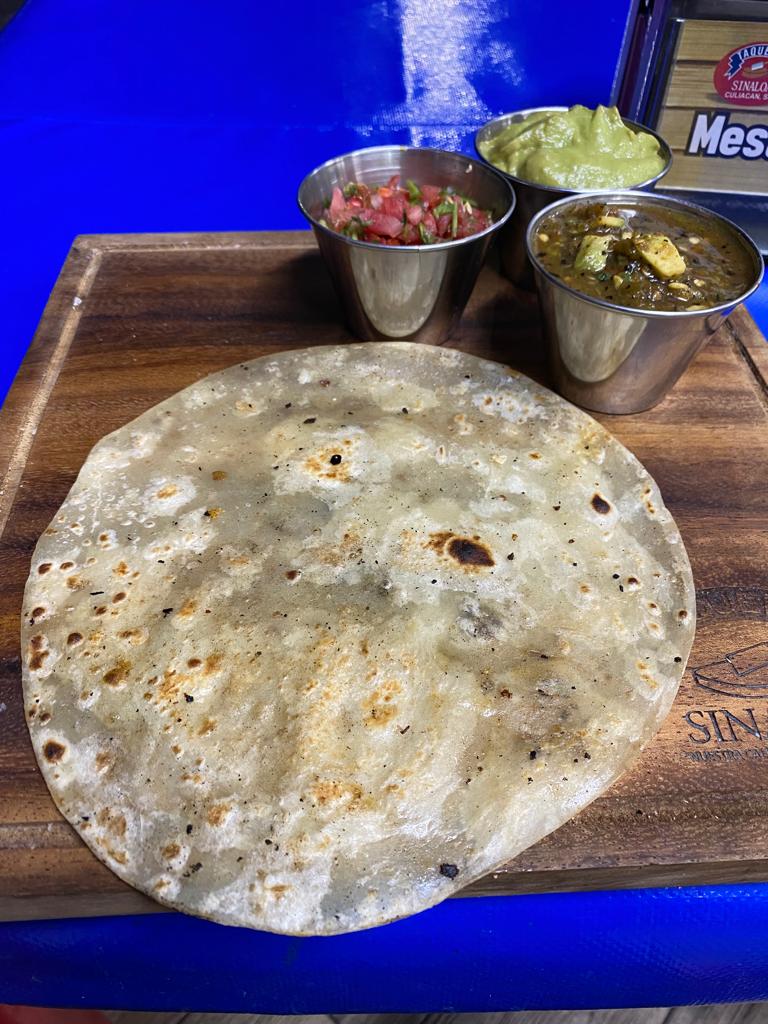 Tortilla de harina con queso, carne asada y tripa.
