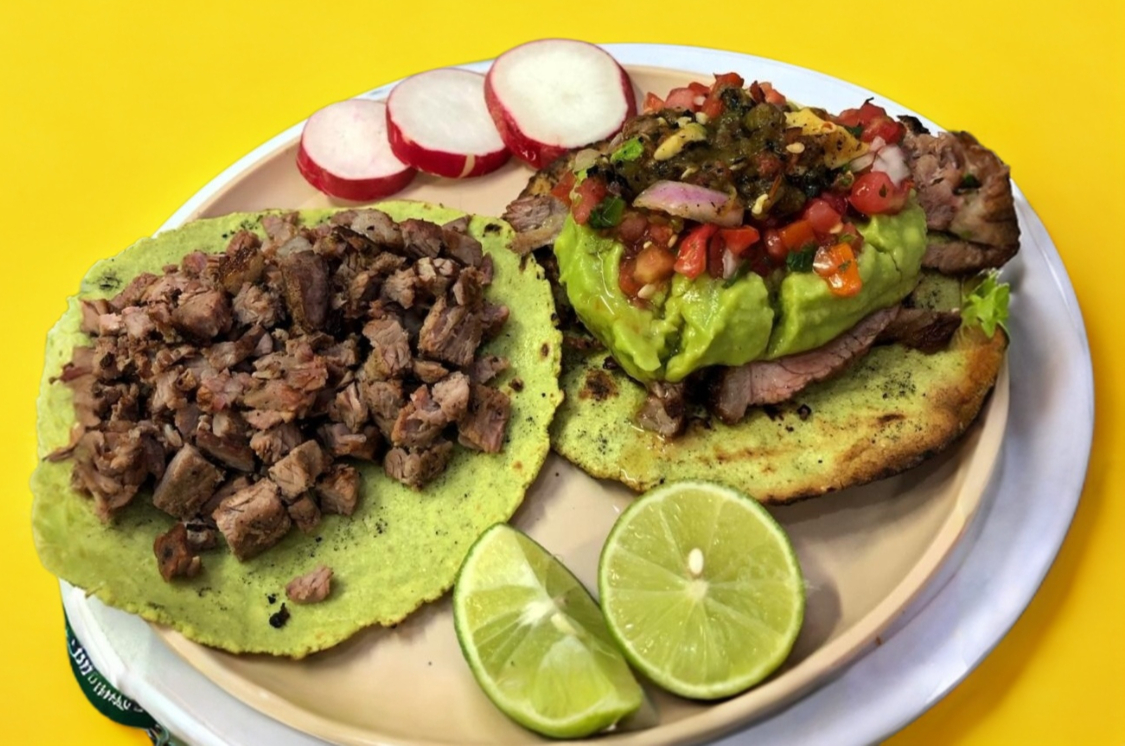 Tortilla de maíz dorada al carbón con carne asada y tripa.