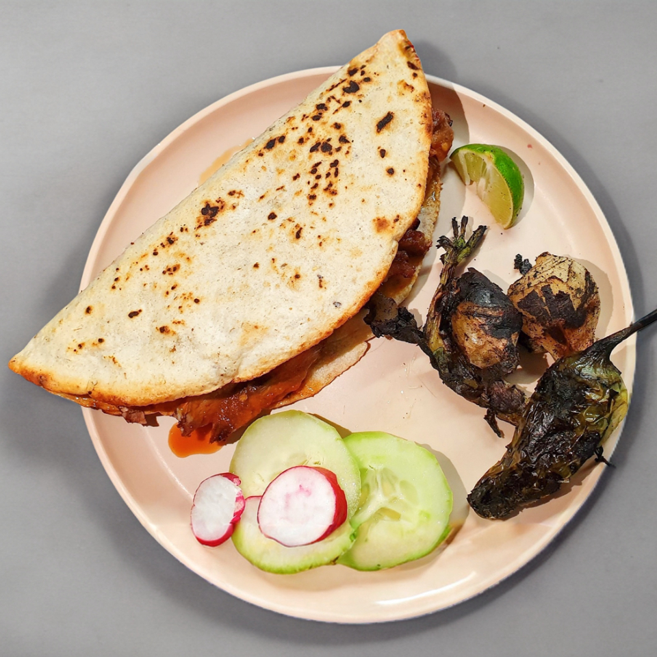 Quesadilla de maíz y carne asada.