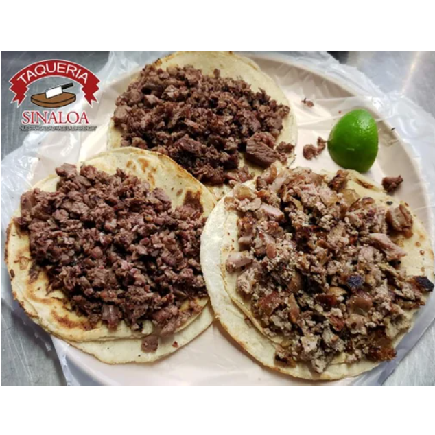 Tortilla de maíz con carne asada y tripa.