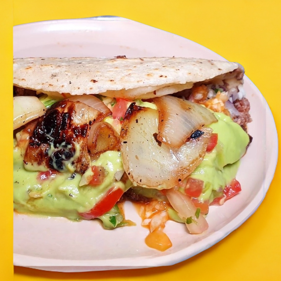 Tortilla de maíz con queso y carne asada.