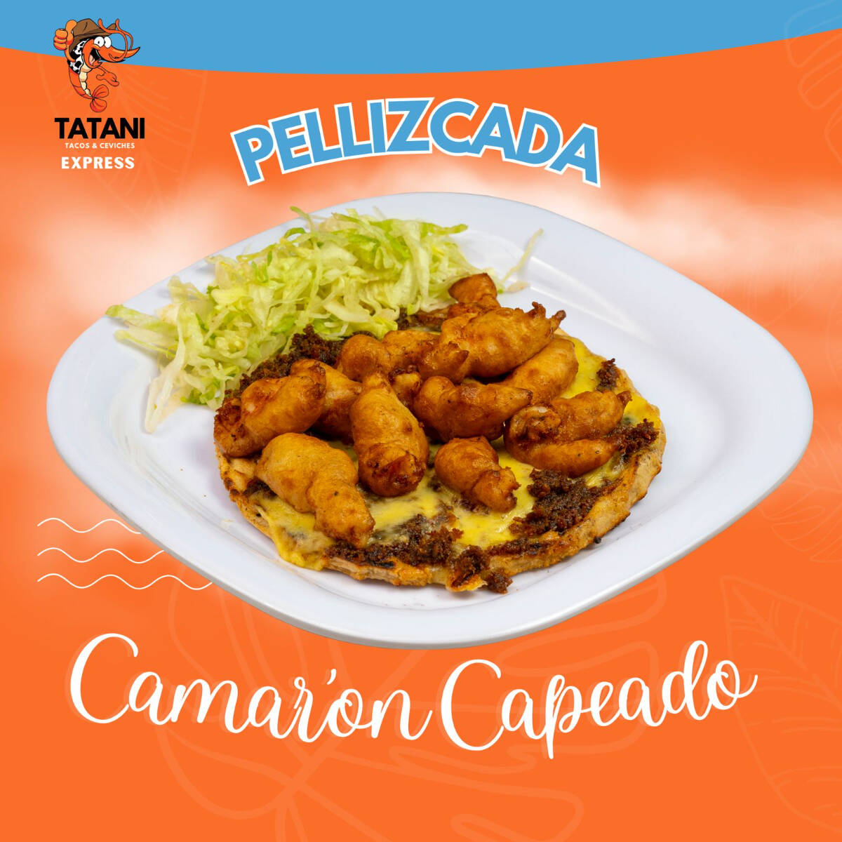 TORTILLA DORADA CON QUESO GRATINADO CON CAMARON CAPEADO Y CARNE ASDA ,ACOPAÑADO DE GUACAMOLE SALSA Y VERDURAS