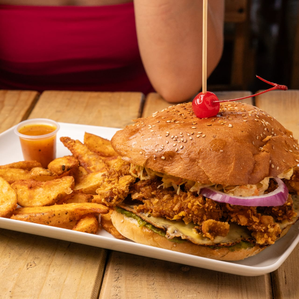 ELABORADA CON PAN JUMBO ENSALADA DE COLY PIÑA,ADEREZO DE MANGO HABANERO Y CAMARONES CRUJIEMTES,ACOMPAÑADA DE PAPAS GAJO CATSUP Y GUACAMOLE