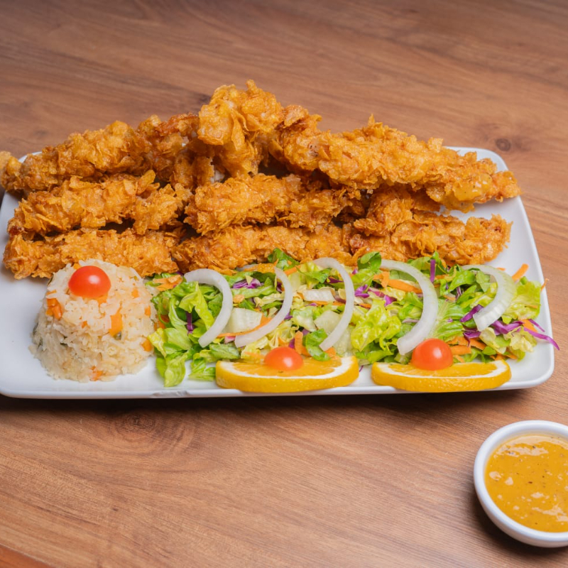 CAMARONES CRUJIENTES CON UNA ADEREZO MANGO HABANERO,ACOMPAÑADO DE ENSALADA,ARROZ,6 TORTILLAS RECIEN HECHAS CON GUACAMOLE ,SALSA Y TORTILLAS,