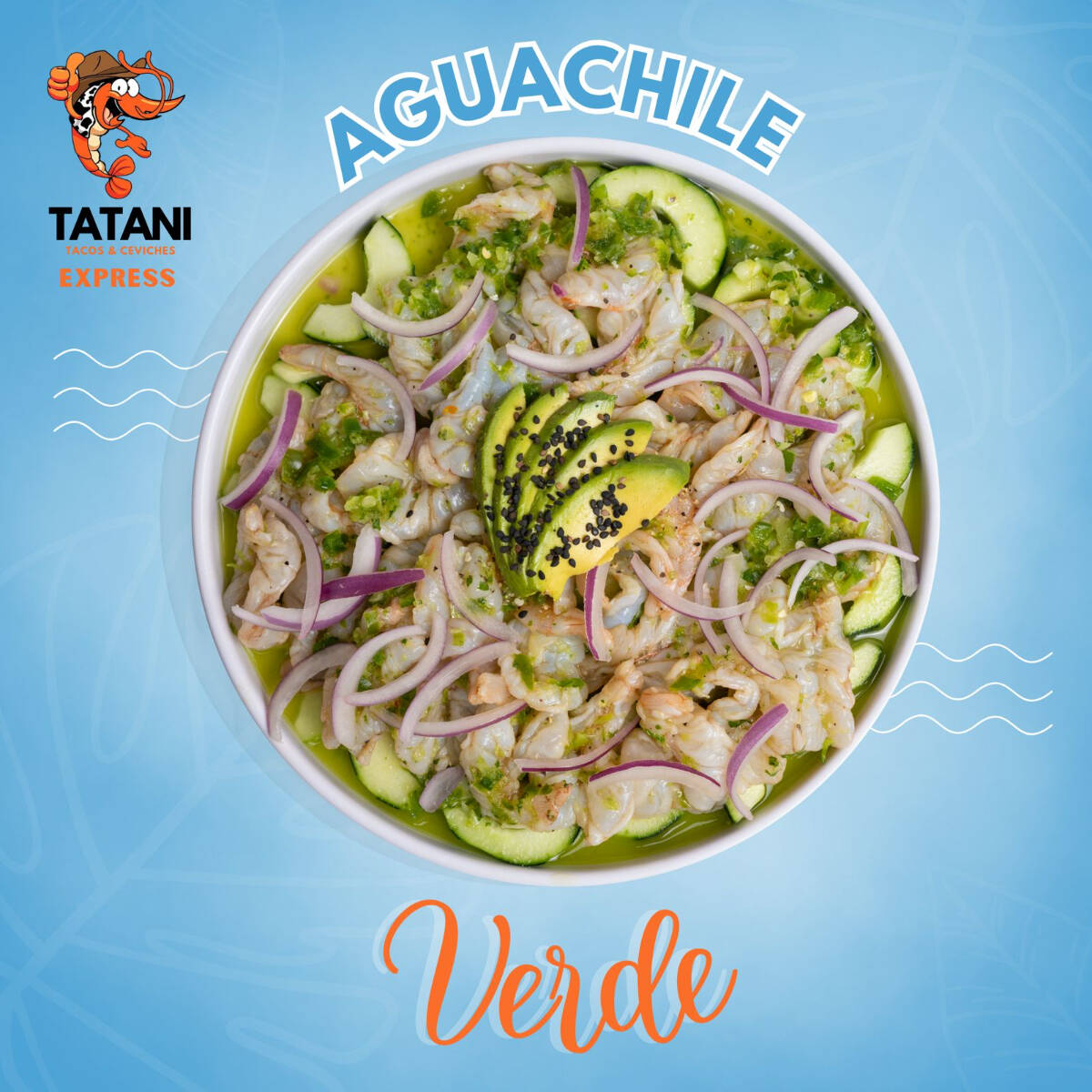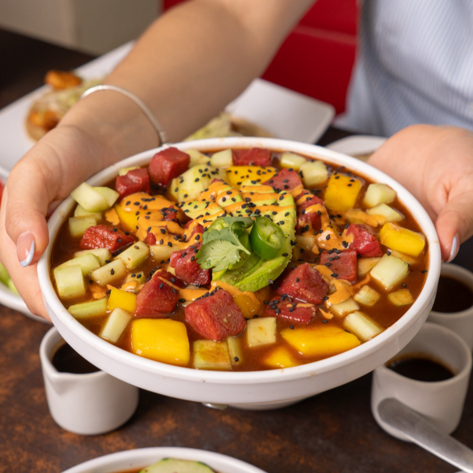 CAMARON CRUDO CAMARON COCIDO ATUN Y MANGO, EN SALSAS NEGRAS CORONADO CON AGUACATE